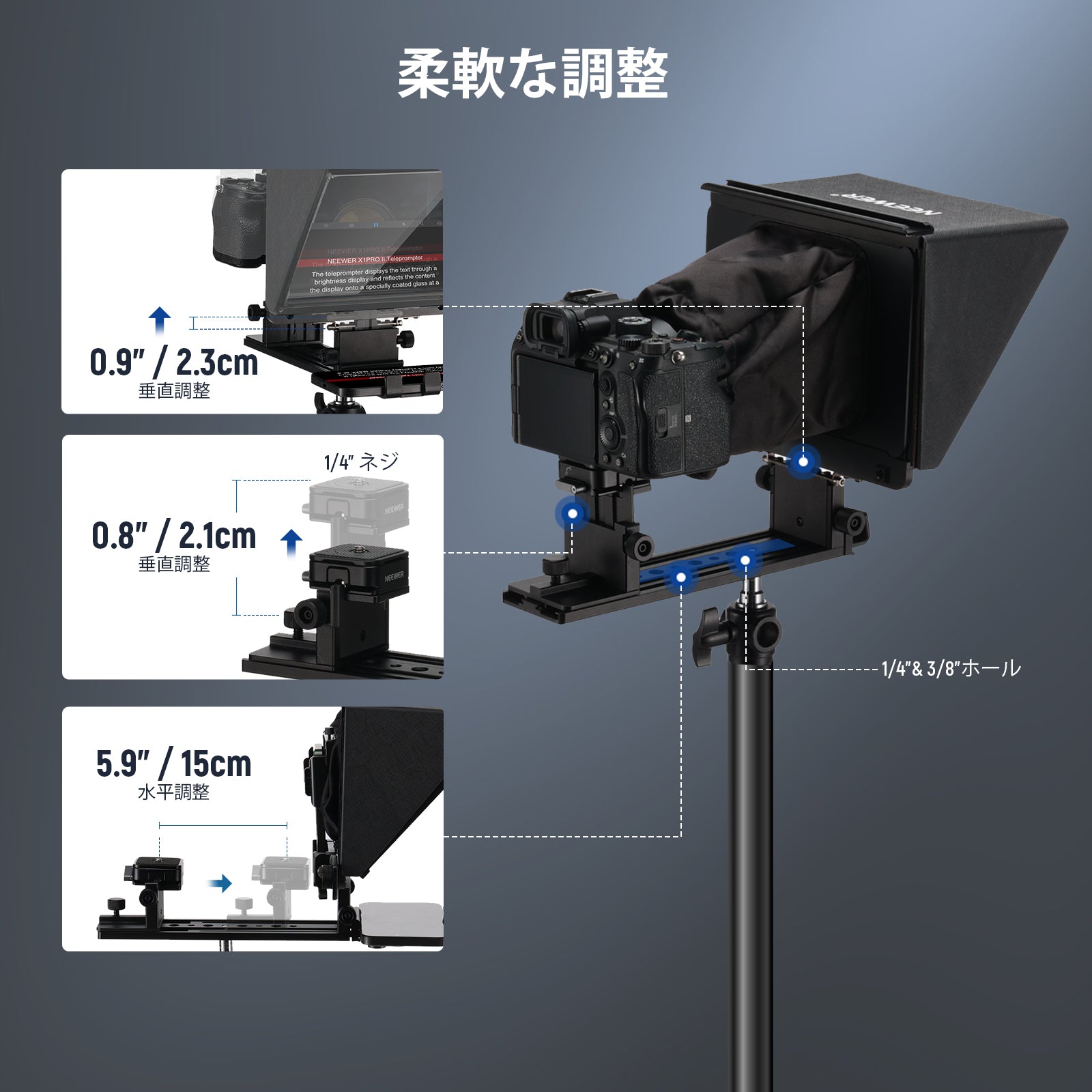 - 【HDビームスプリッター/取り付けポイント】9"HD ビームスプリッター ガラスは、安心できる明瞭さで台本を反射します。75% の光透過率、0.9"/2.3cm の垂直調整機能、および2mの読み取り範囲を備えており、暗誦することなく台本全体を楽に読むことができます。 すべての言葉を事前に。 いくつかの 1/4 "および 3/8 "のネジでプロンプターを三脚またはカメラ スタンドに接続し、上部のコールドシュー スロットはミニマイク、LEDライト、その他のアクセサリの取り付けに適しています。