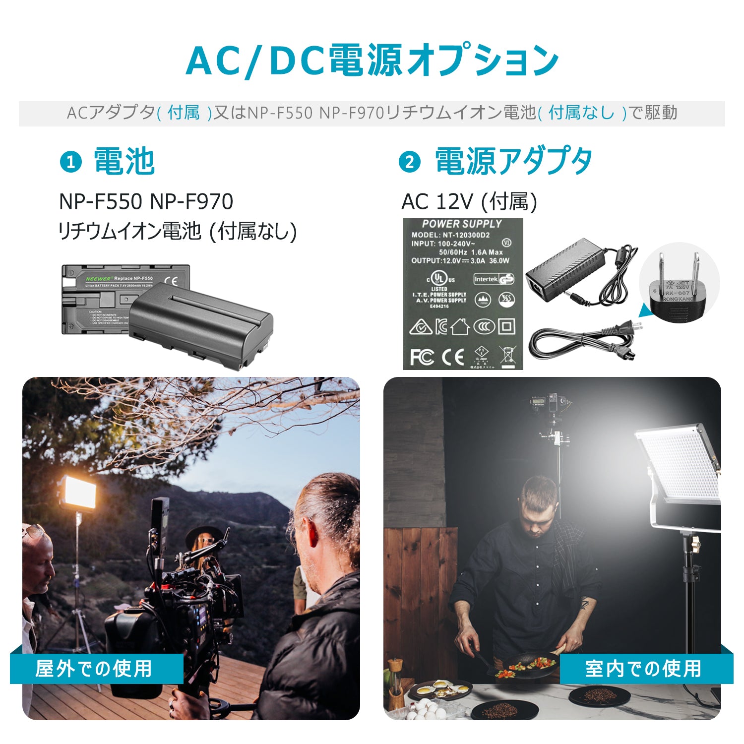 - AC/DC電源オプション:ACアダプター(付属)またはソニーNP-F550 NP-F970リチウムイオンバッテリー(バッテリーは別売)。