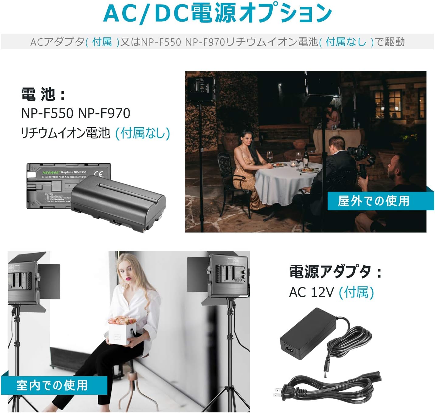 - AC / DC電源オプション:ACアダプター(付属)またはNP-F550 NP-F970リチウムイオンバッテリー(別売)で給電されます。
