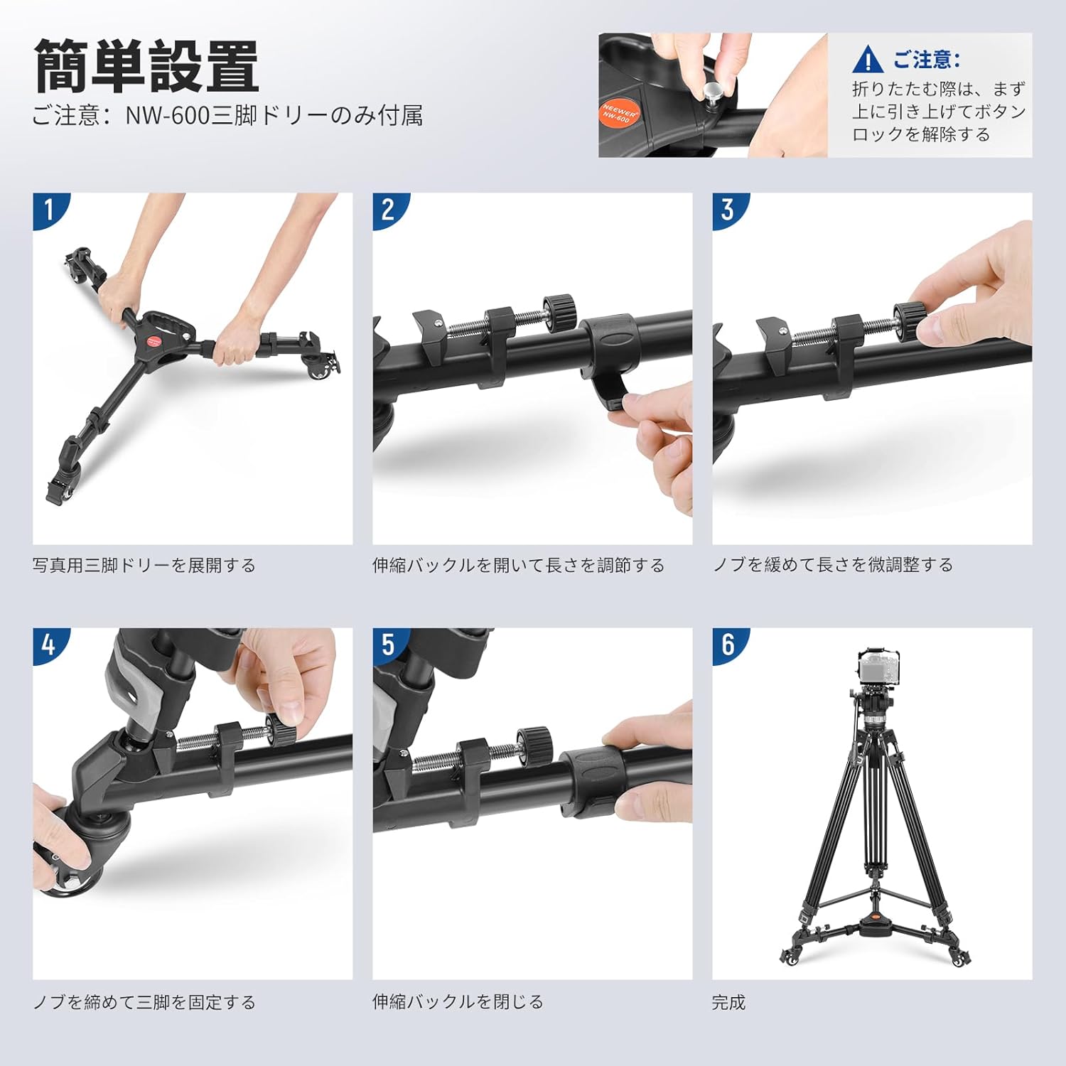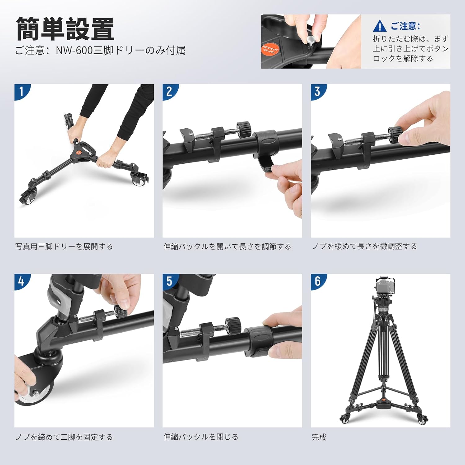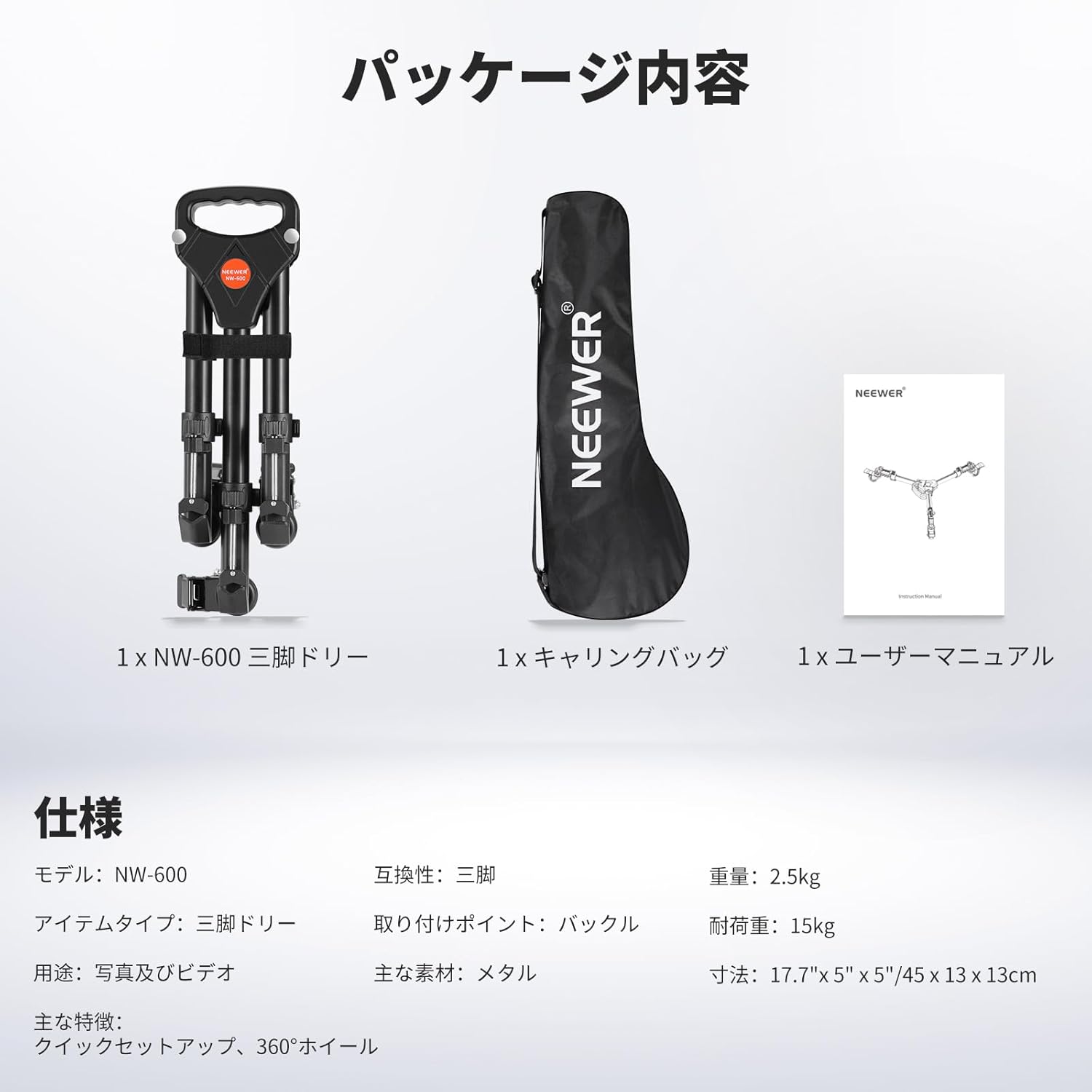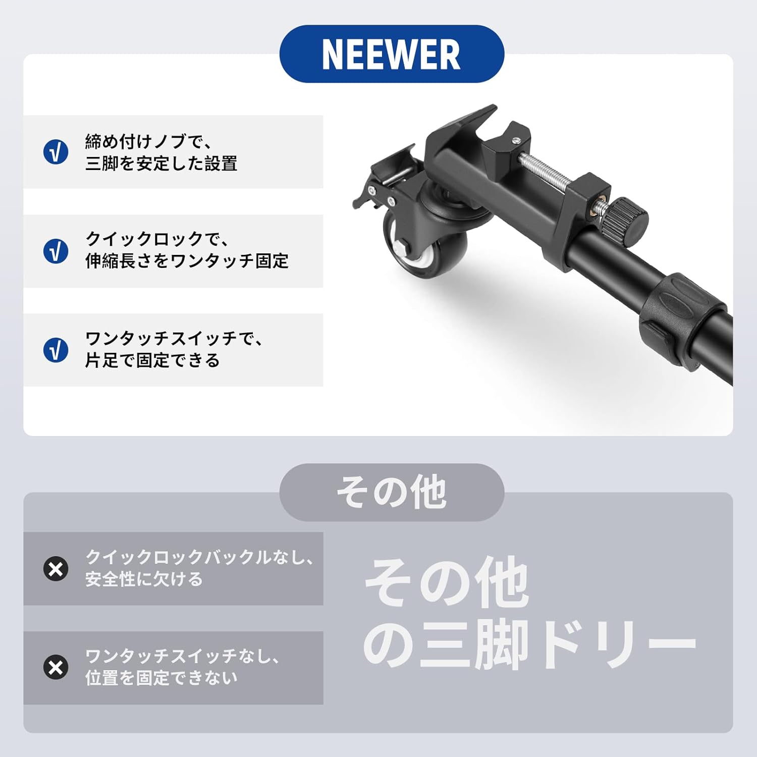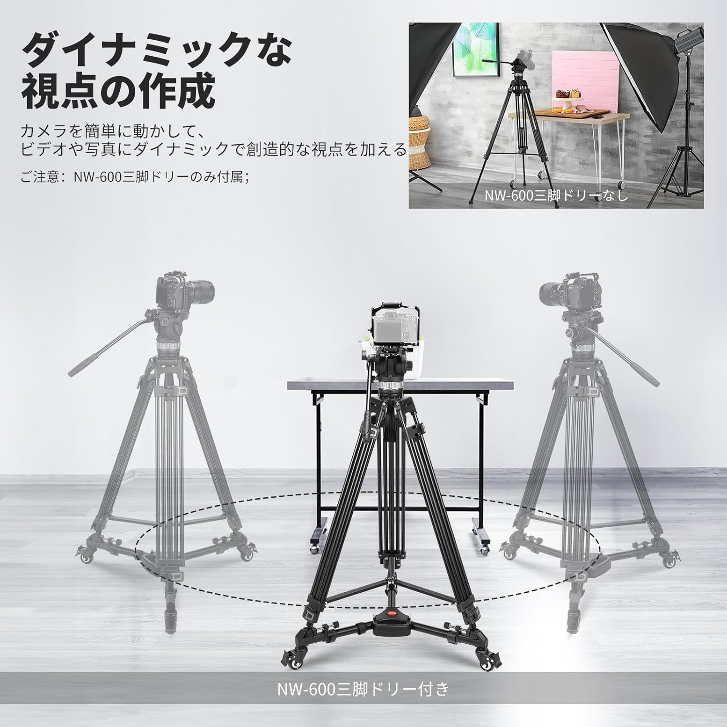 - 広い互換性:三脚ドリーは標準的な三脚やライトスタンドに適します。迅速かつ簡単にお使いの三脚を移動可能なものに変換し、三脚を移動しながら、安全に静かにショートを取れます。