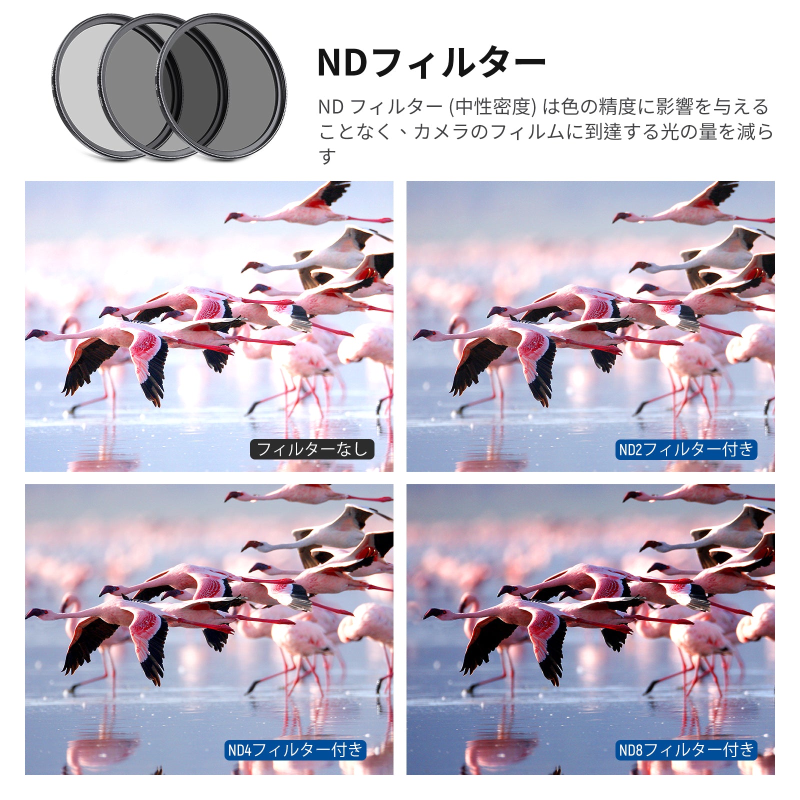 【NDフィルターによるバランスとれた露出】NDフィルターは、カメラセンサーに入る光の量をさまざまな角度で減らす: ND2は1ストップ、ND4は2ストップ、ND8は3ストップで、さまざまな光条件下で画像全体のバランスの取れた露出を実現します。これらのND フィルターは、シャッタースピードを遅くすることで長時間露光撮影も可能にします。