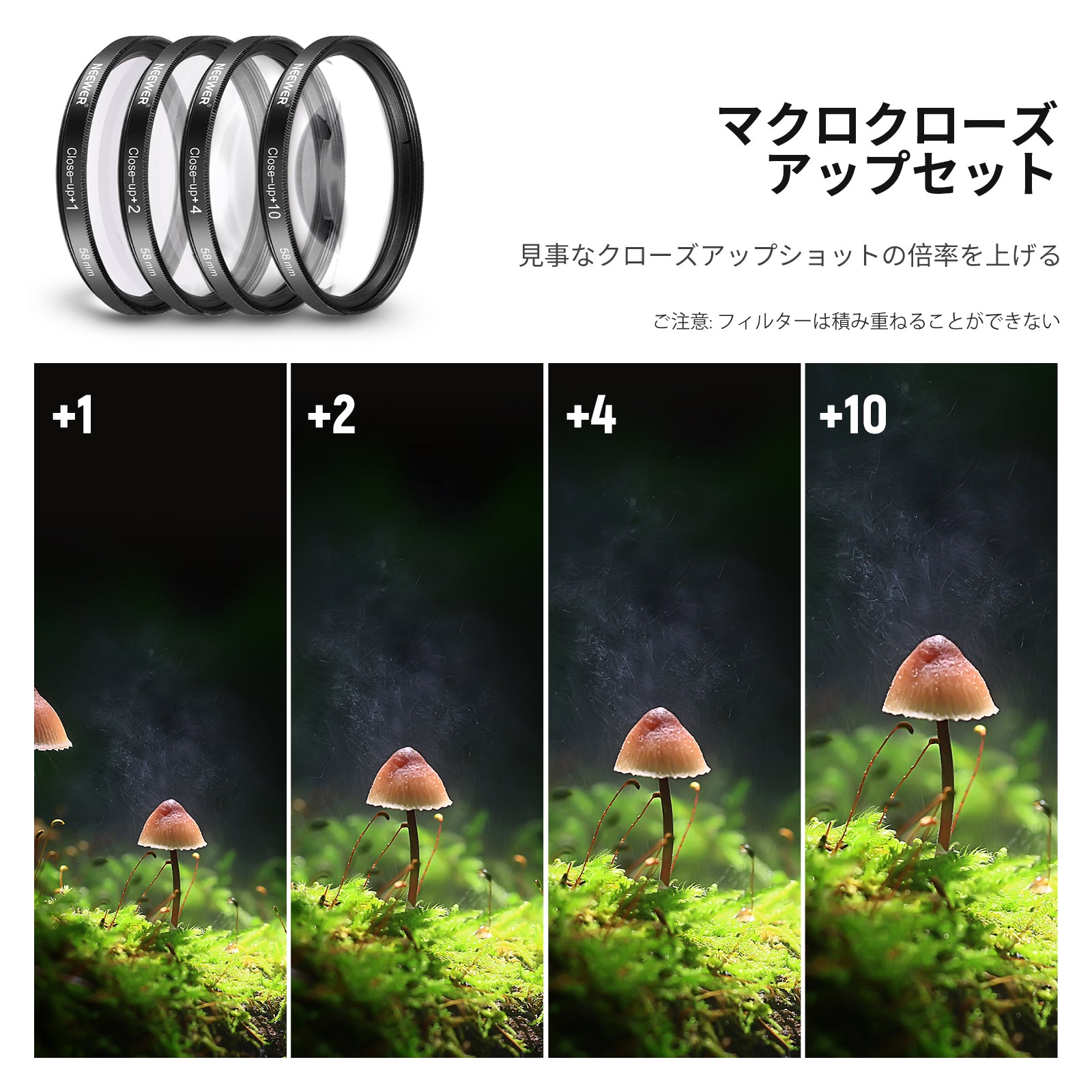 【マクロ撮影用クローズアップフィルター】マクロクローズアップフィルターは、花、昆虫、コインなどの撮影対象を+1、+2、+4、または+10倍に拡大してより詳細をキャプチャし、マクロ撮影に適しています。★ご注意★:異なる接写フィルターを重ねて使用することはサポートされていません!