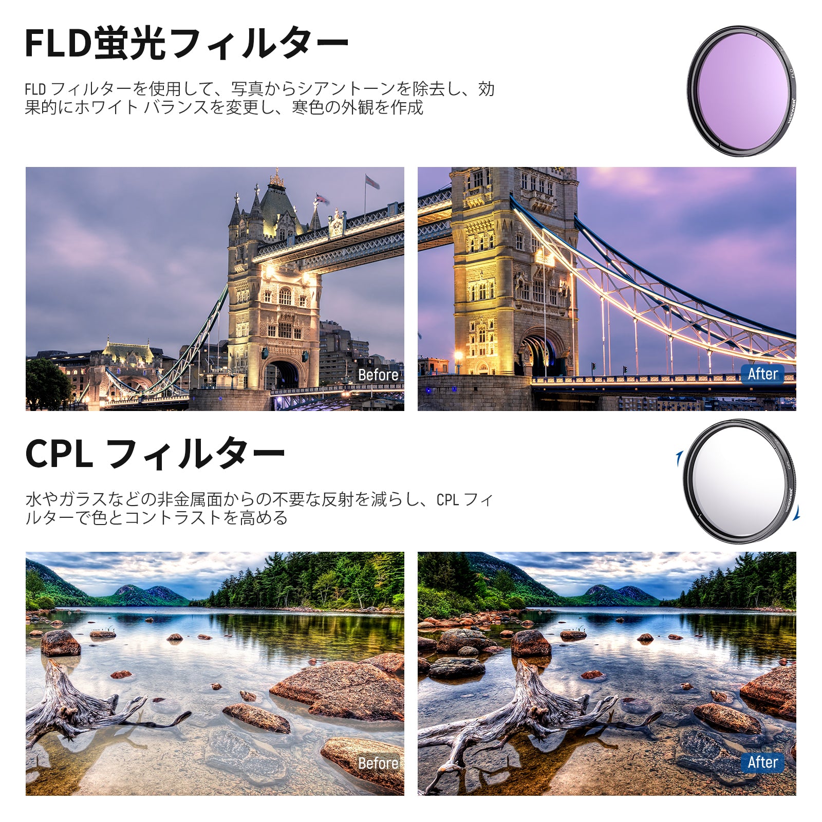 【CPL/UV/FLDフィルターによる光制御】CPLフィルターを使用して、水、葉、ガラス窓、その他の非金属表面からの不要な反射を減らします。UV フィルターを適用して紫外線をブロックし、レンズを保護します。FLD 蛍光フィルターも含まれており、写真から蛍光または「緑がかった」トーンを除去して、優れた光学的透明度を実現します。2つのレンズフードは強い日差しを効果的にカットできます。