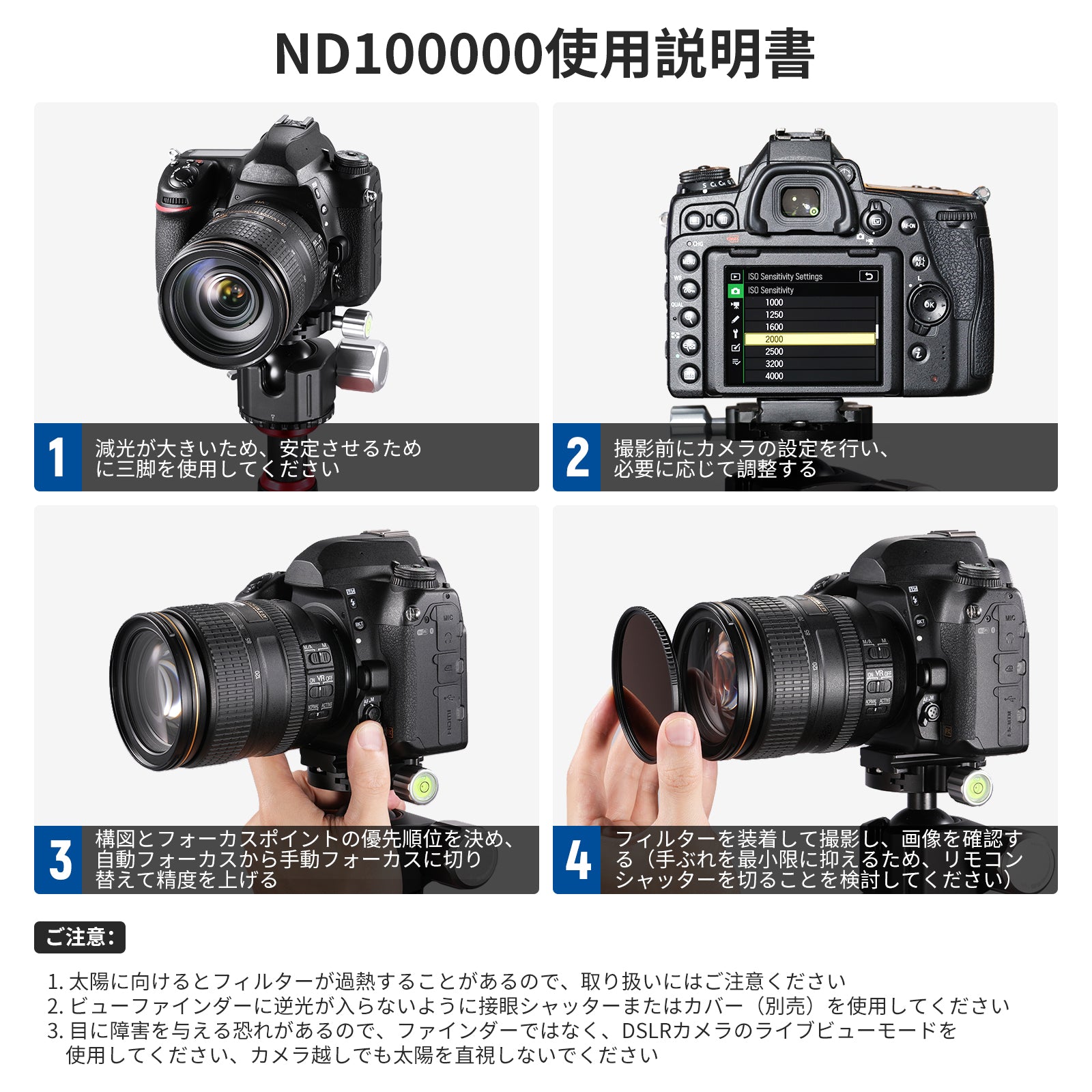 【正しい使用方法】1. 構図を設定し、カメラを三脚に固定し、手ぶれやブレを防ぎます。2. フォーカスポイントを確認し、マニュアルフォーカスに切り替えます。3. NDフィルターを取り付け、シャッターケーブルを使用します。4. 画像を確認し、希望する結果になるように絞り、ISO、シャッタースピードを調整します。シャッタースピードを遅くするにはF値を大きくし、シャッタースピードを速くするにはISOを上げます。