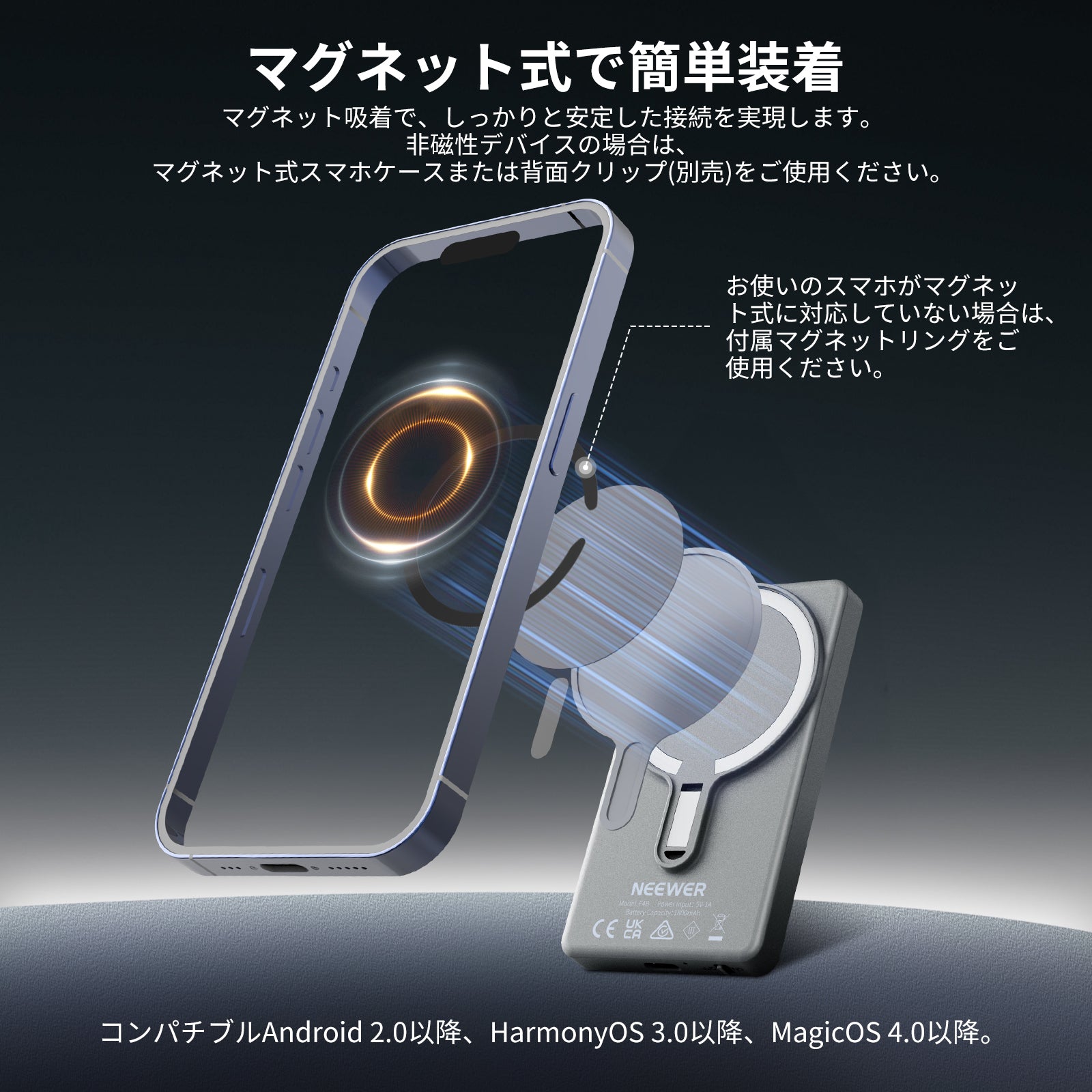 - 【マグネット式&簡単接続】スマホバックカメラモニターはマグネット吸着でMagsafe対応スマホに簡単に取り付けられ、安全で安定した接続を実現します。非磁性デバイスの場合は、マグネット式ケースを装着するか、背面のスマホクランプ(別売)をご使用ください。Android 2.0以降、HarmonyOS 3.0以降、MagicOS 4.0以降に対応しています。ご注意: iPhone、Google スマホには対応していません。