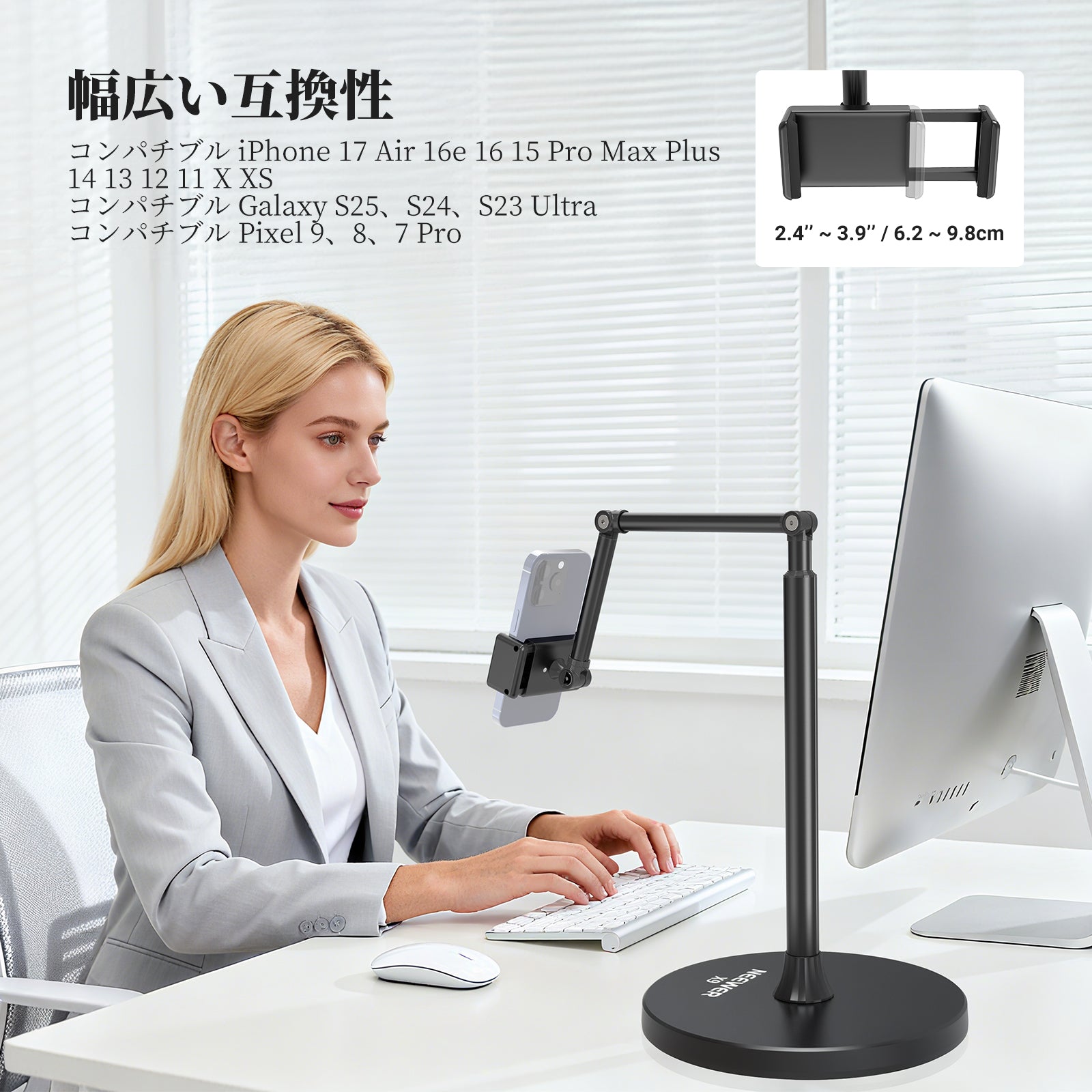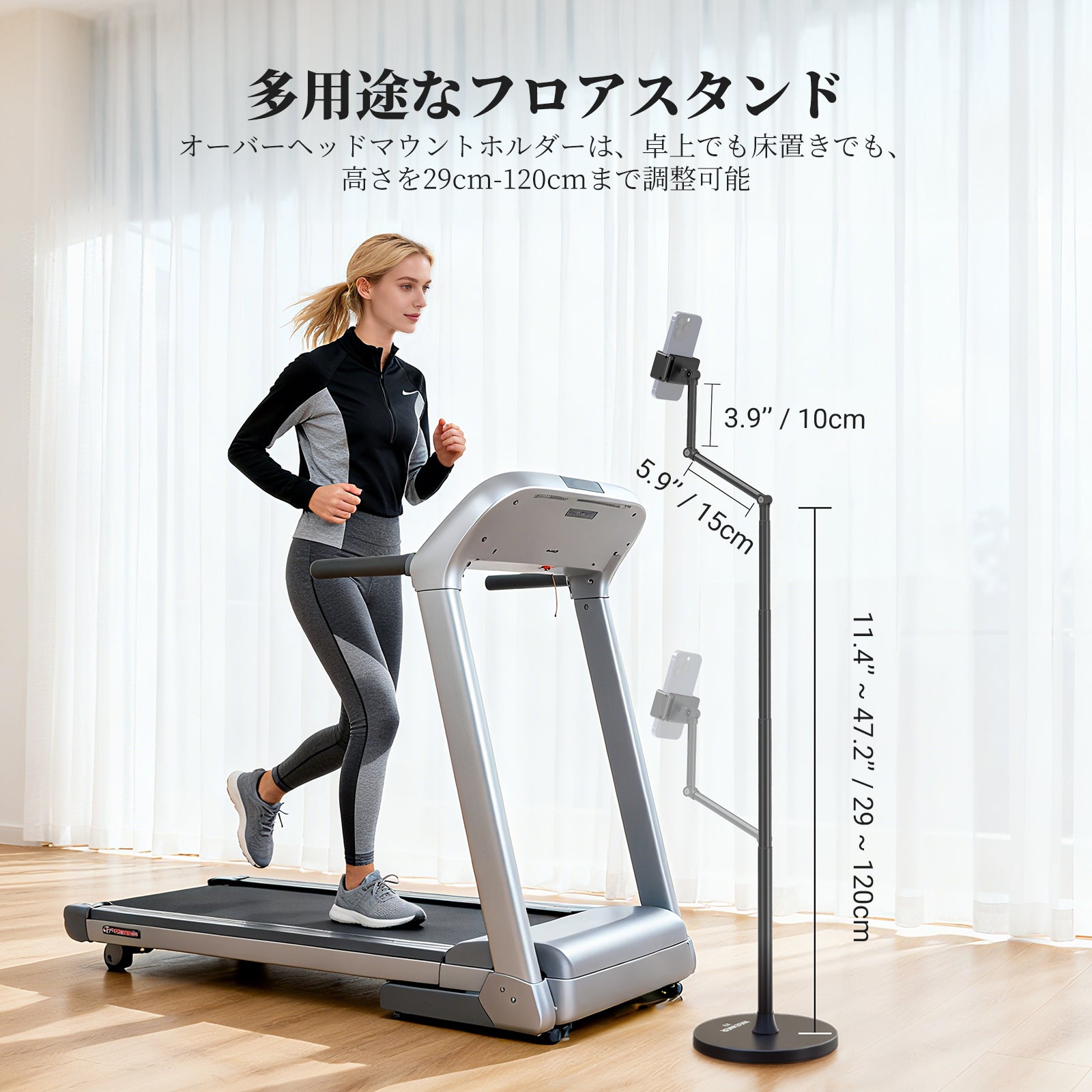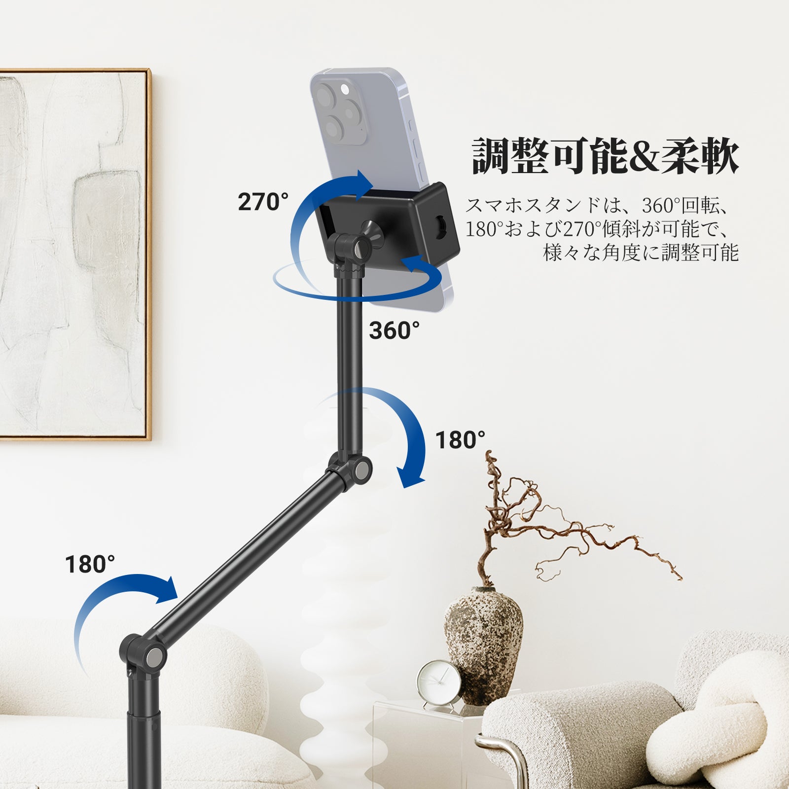 - 【多用途なフロアスタンド】オーバーヘッド式スマホマウントホルダーは、卓上や床置きでの使用に合わせて29cm-120cmまで調整可能です。伸縮アームは最大90cmまで伸びるため、Vlog、生放送、ビデオ録画に最適です。