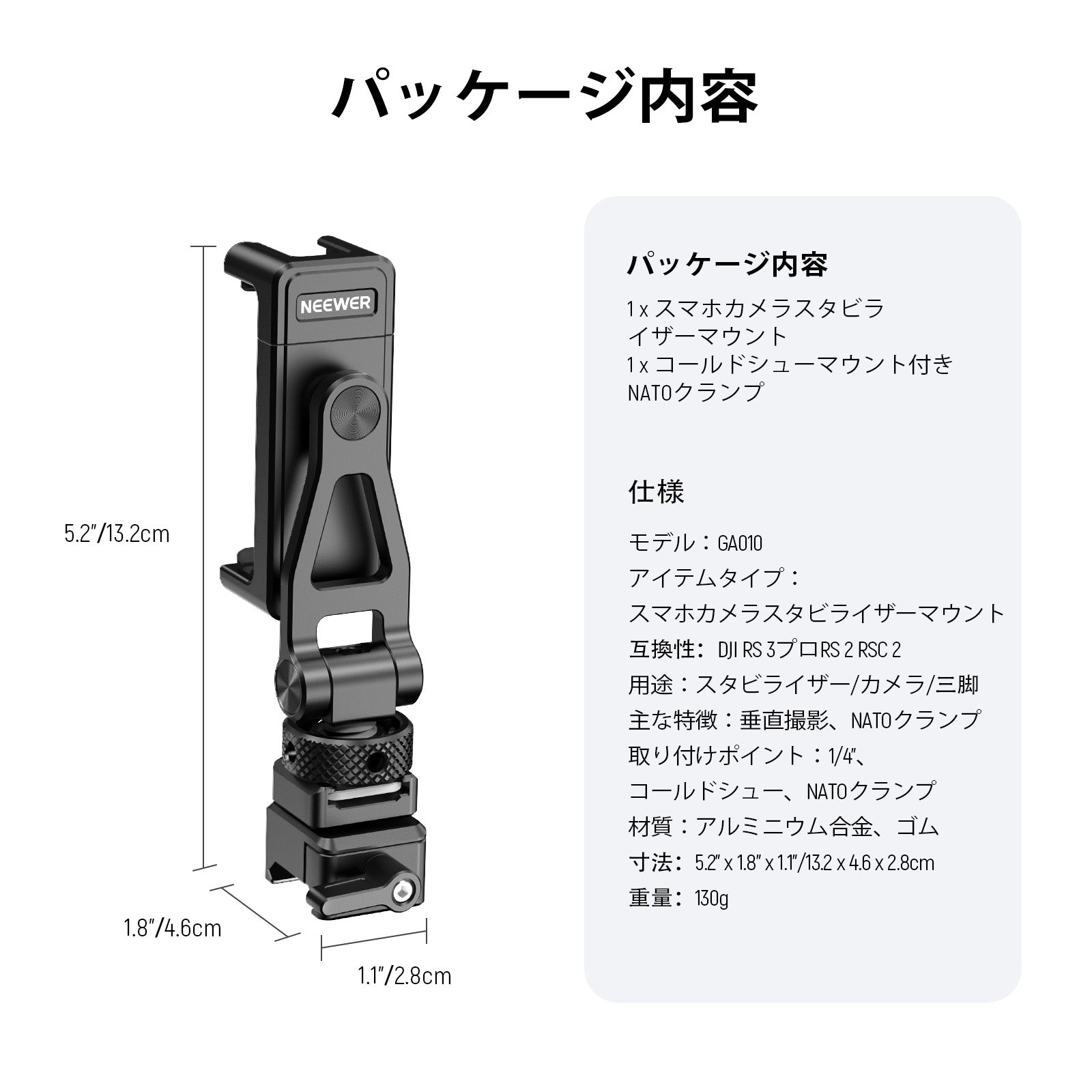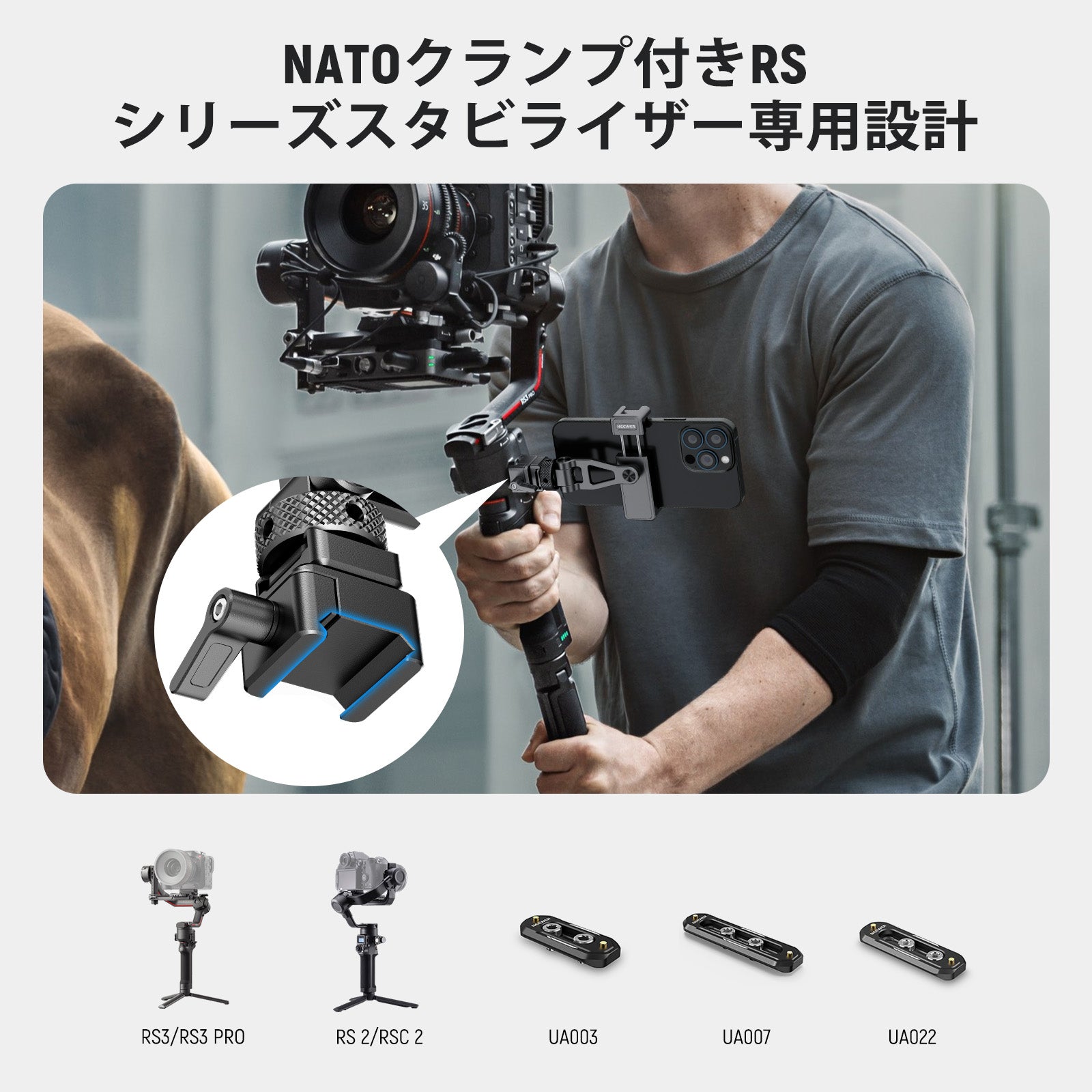 【NATOクランプ付きRSシリーズスタビライザー用設計】取り外し可能なNATOクランプはコンパチブル DJI RS3 Mini RS3 PRO RS3 RS2 RSC 2、カメラモニターとしてRSシリーズのジンバルにスマホカメラマウントを取り付けるのに役立ちます。また、NATOクランプ付きスマホホルダーをNATOレール(NEEWER UA003 UA007 UA022)付きカメラケージビデオリグに取り付けることもでき、コンパチブル SmallRigケージNATOクイックリリースシリーズアクセサリー。