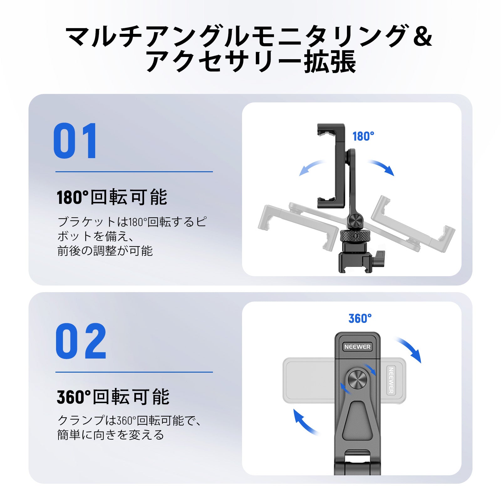 【多角度調整可能なピボット&アクセサリ拡張】クランプは360°回転可能で垂直と水平の切り替えが容易で、ブラケットは前後に調整できる 180 度回転ピボットを備えており、俯瞰、仰角、垂直の撮影角度に最適です。クランプの両側に LED ビデオ ライト、RGB ライト、無線ラベリアマイクなどに対応するコールドシューマウントがあります。