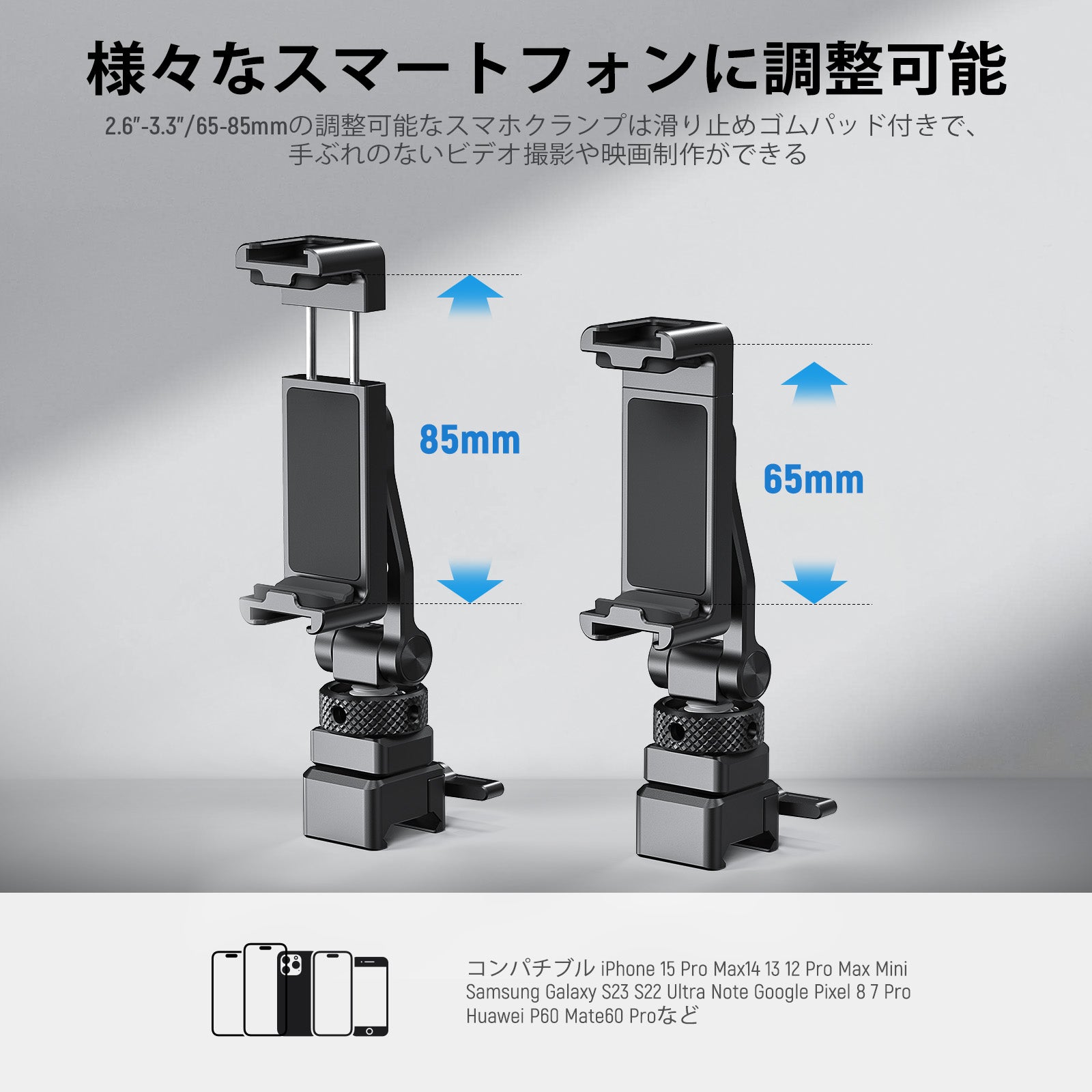 【様々なスマホに対応】2.6"-3.3"/65-85mm調整可能なスマホクランプはコンパチブル iPhone 16 15 Pro Max 14 13 12 Pro Max Mini Samsung Galaxy S24 S23 S22 Ultra Note Google Pixel 9 8 7 Pro Mate60 Proなど、滑り止めゴムパッドが手ぶれのないビデオ撮影と録画を保証します。