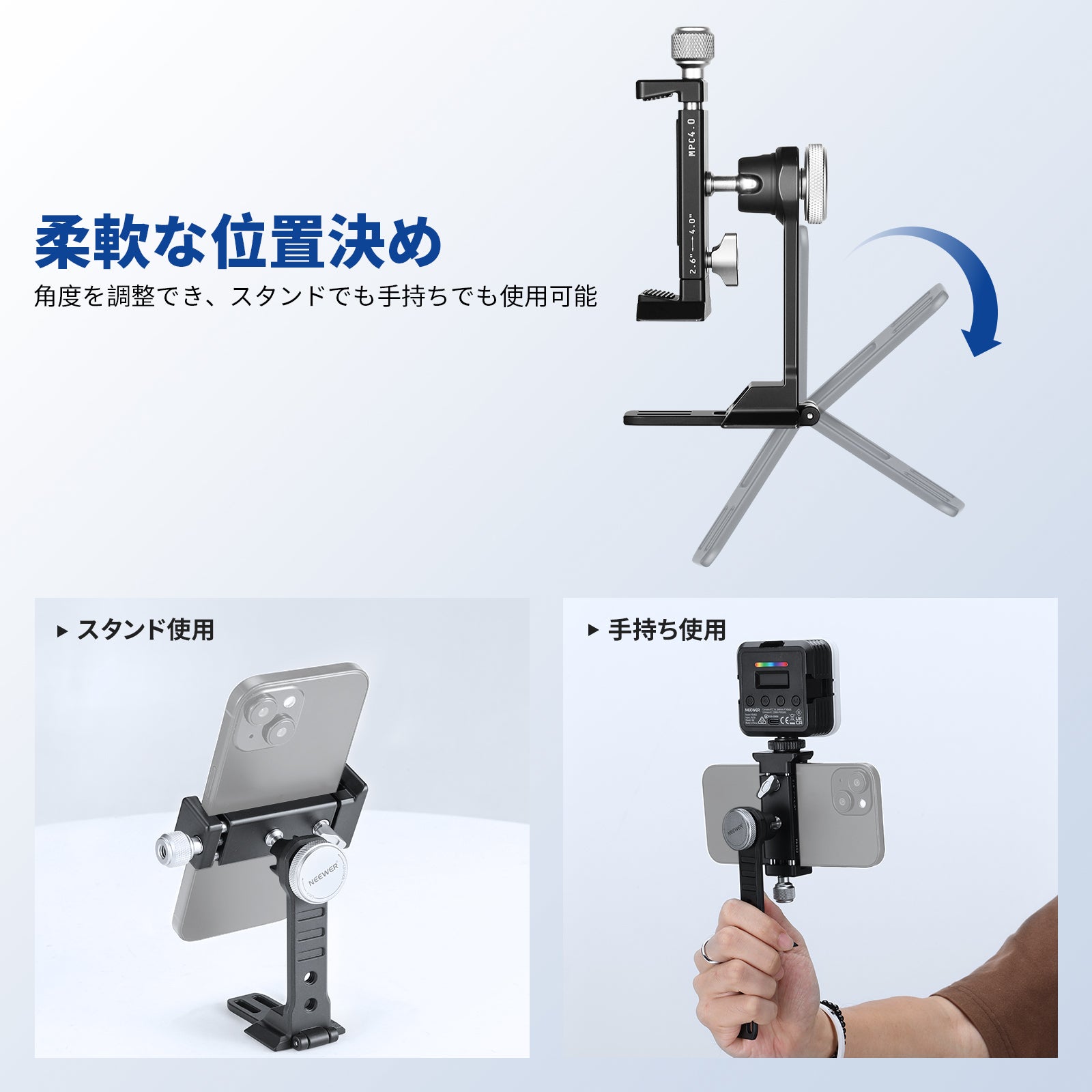 - 【内蔵折りたたみ式スタンド】折りたたみ式スタンドがスマホ三脚アダプターに内蔵され、マウントを独立した卓上スタンドに変身させ、ビデオ通話、自撮り、リモートワーク、生放送などに使用できます。