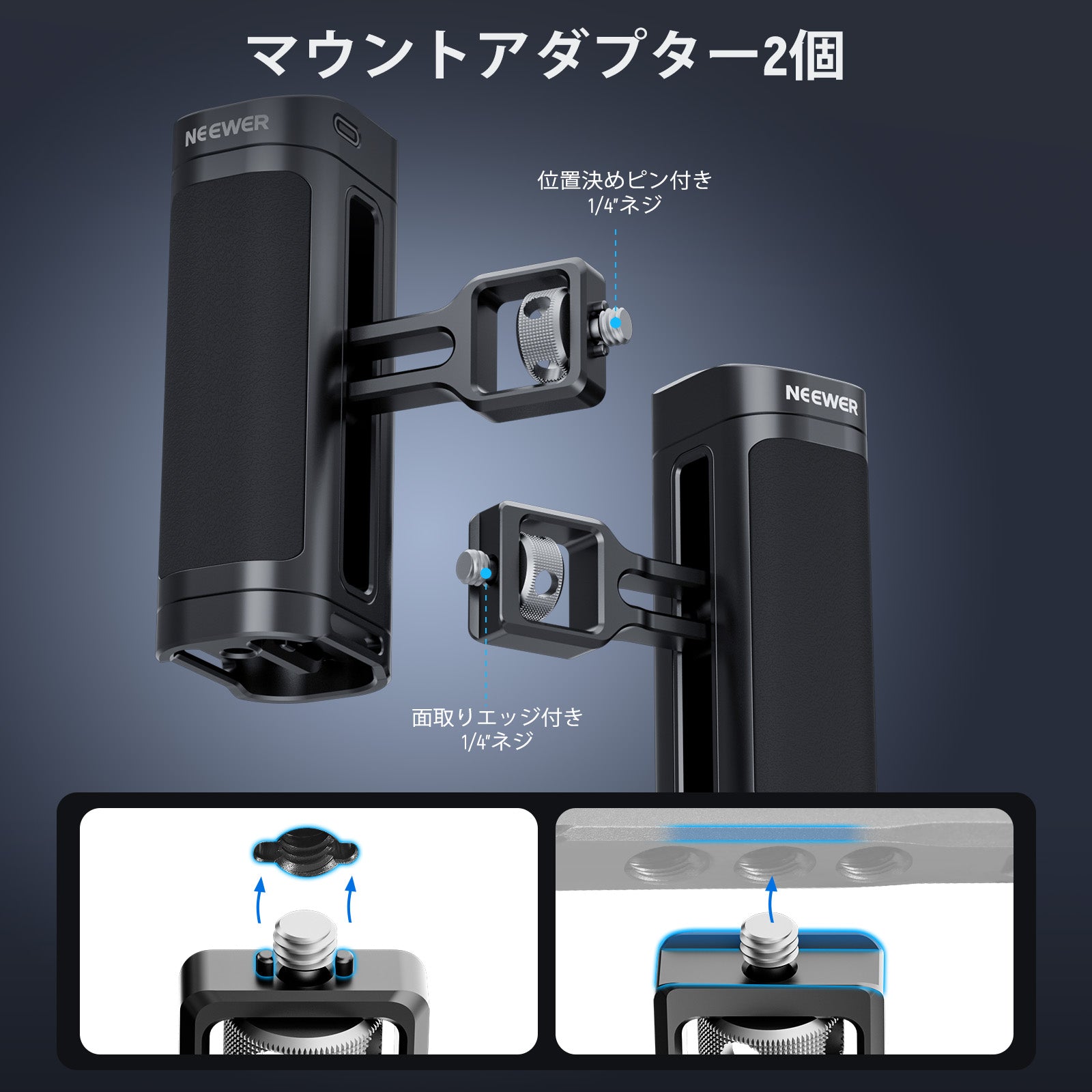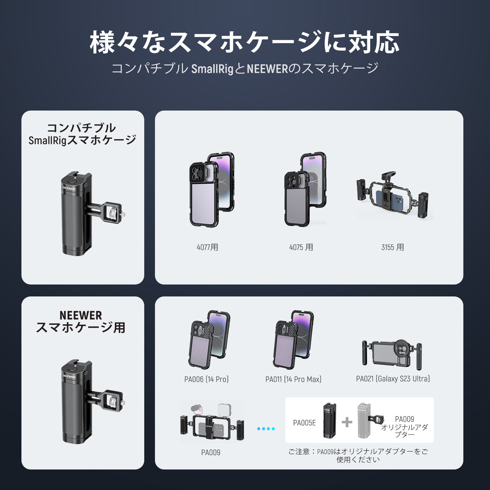【コンパチブルNEEWERフォンケージ】1/4 インチネジとねじれ防止面取りコーナーを備えたものは、PA006 (16 15 14 Pro)、PA011 (16 15 14 Pro Max)、PA016 (Galaxy S22 Ultra)、PA021 (Galaxy S23 Ultra) およびiPhone 16 Pro Max Plus用ケージなどの NEEWER ケージに適合します。PA009の場合は、オリジナルのアダプターをご使用ください。