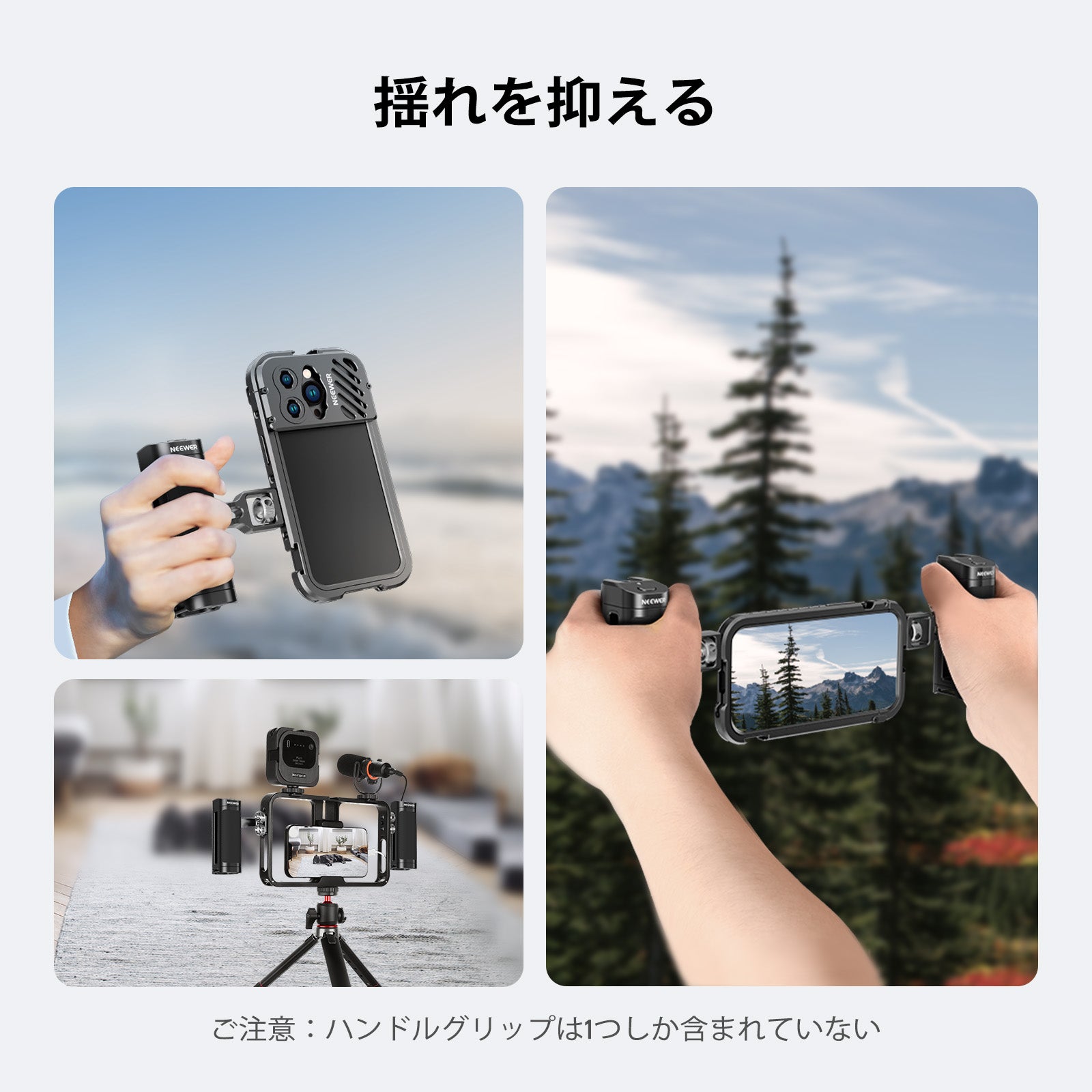 【取り付け調整可能】付属のL字型六角レンチをサイドハンドルグリップの下に磁石で取り付けて使用すると、取り付けと取り外しが簡単になります。 サイド ハンドル グリップは、左利き用または右利き用にスマートフォン ケージのどちらかの側に取り付けることができます。また、アクセサリの配置と重心に基づいて垂直位置を調整して、グリップ エクスペリエンスを向上させることもできます。