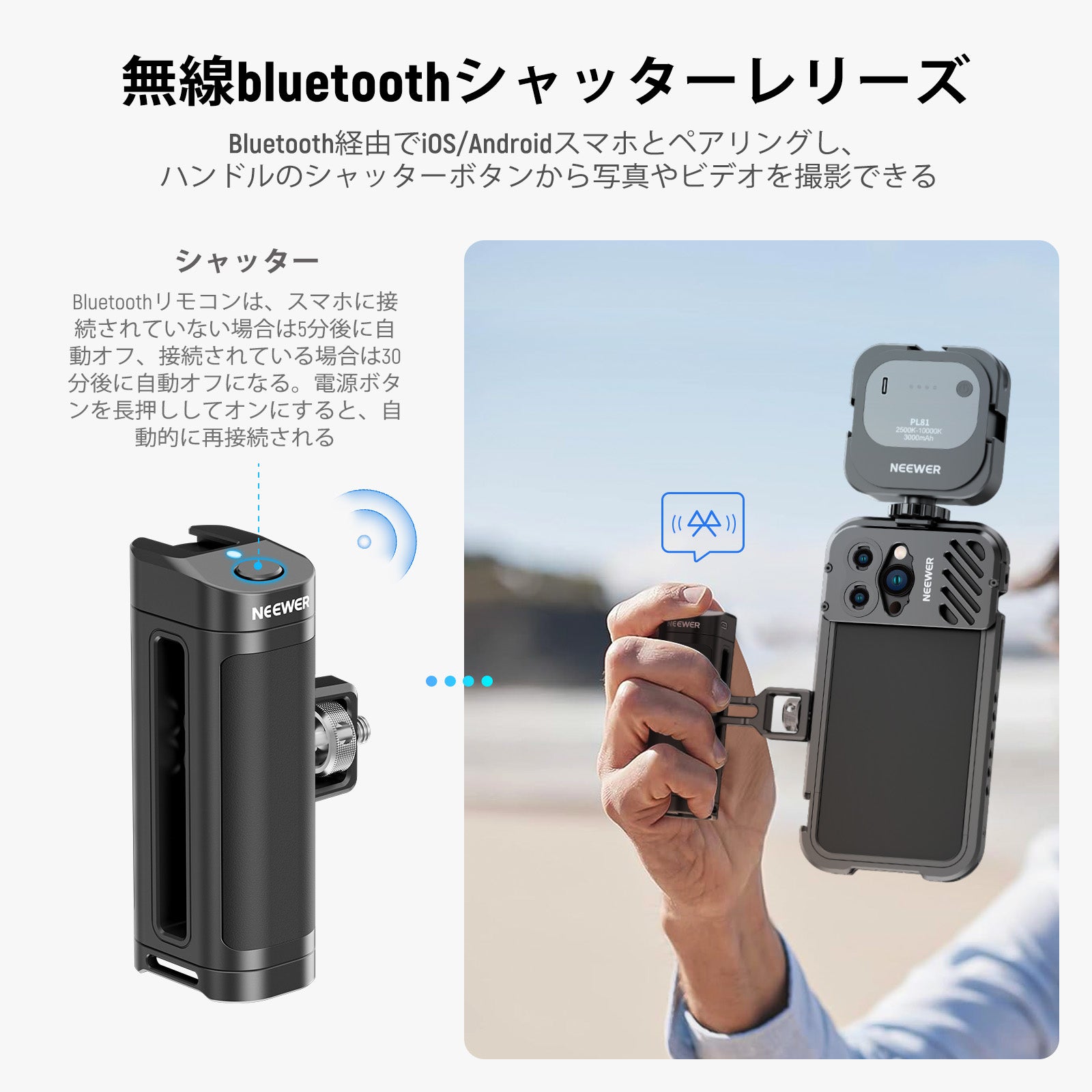 【Bluetoothによる無線シャッターレリーズペアリング】 NEEWER PS005E スマホケージ用サイドハンドルグリップは、100mAh充電式電池と無線リモコンモジュールを内蔵しています。Bluetooth 経由で iOS/Android スマートフォンとペアリングし、シャッター ボタンを使用して写真やビデオを撮影できます。 USB Type Cポート経由で充電しながらグリップを使用できます。 LEDインジケーターは、さまざまな色で操作手順をガイドします。
