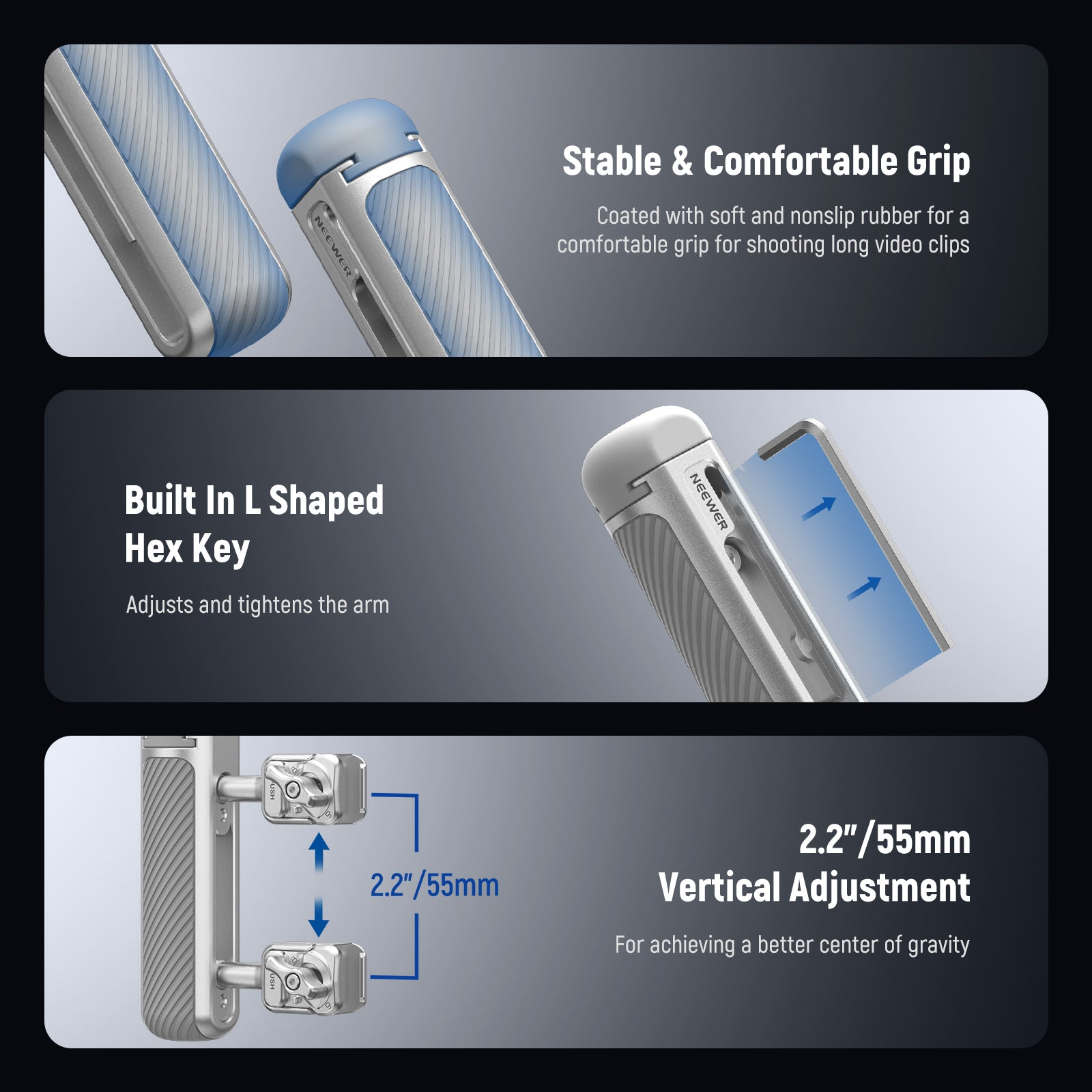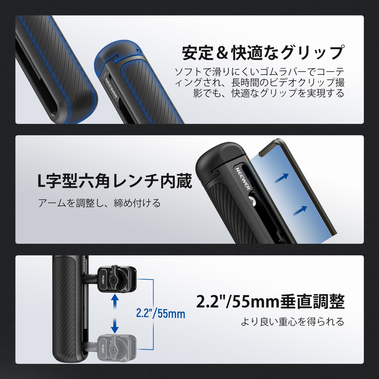 - 【360°回転&垂直調整】スマホハンドルグリップは360°回転可能で、サイドハンドルとしても、ローアングル撮影用のトップハンドルとしても使用できます。また、2.2"/55mmの上下調節が可能で、より良い重心を実現します。