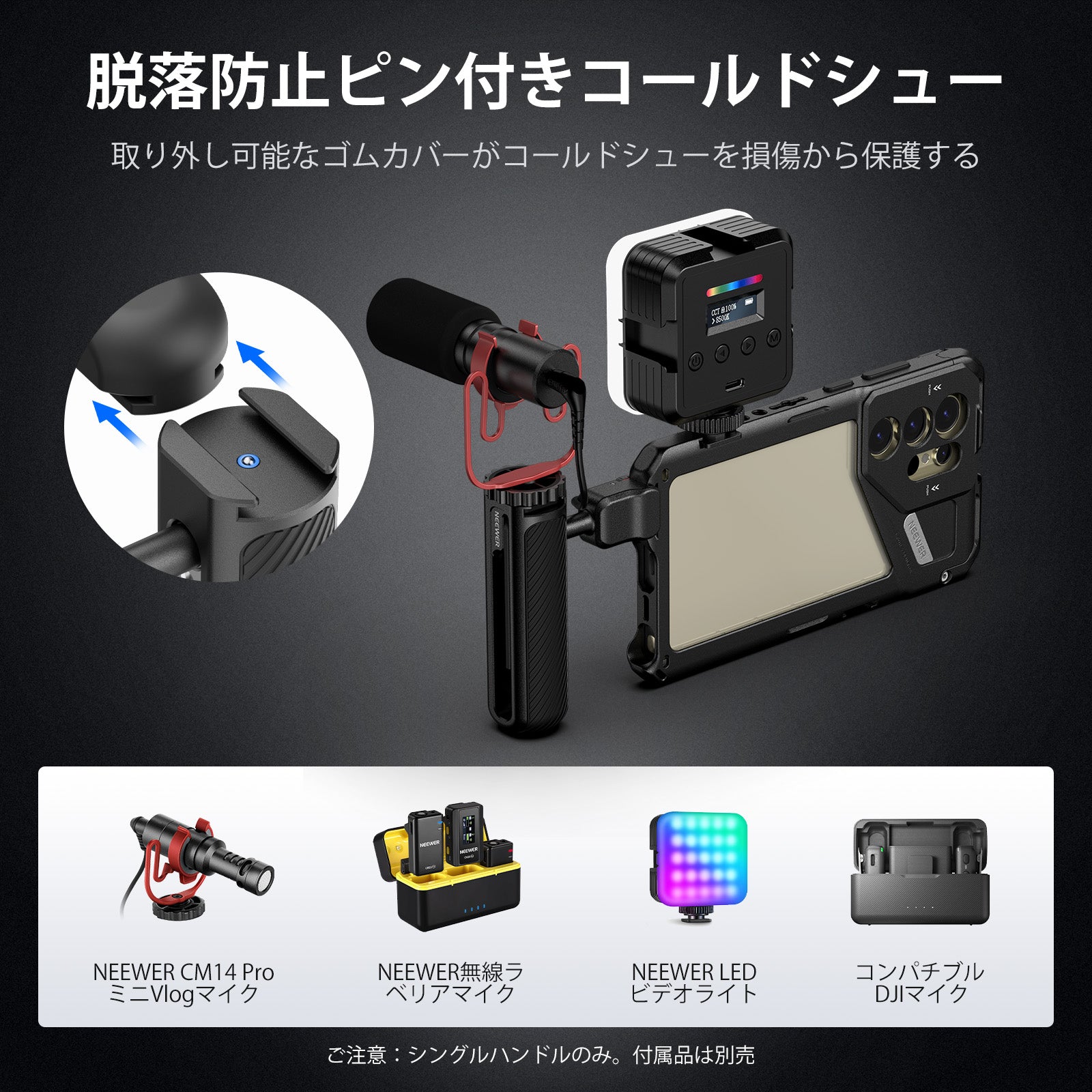 - 【オフ防止ピン付きコールドシュー】内蔵のコールドシューはコンパチブル NEEWER CM14 Pro Mini Vlog Microphone、CM22/CM28無線ラベリアマイク、PL81/RGB61/RGB62 LED ビデオライト、コールドシューアダプターを備えたその他のアクセサリー。取り外し可能なラバーカバーがコールドシューを損傷から守ります。コールドシューブラケット内の格納式スプリング式外れ防止ピンは装着したアクセサリーが滑り落ちるのを防止し、コンパチブル DJIマイク、確実に装着できます。