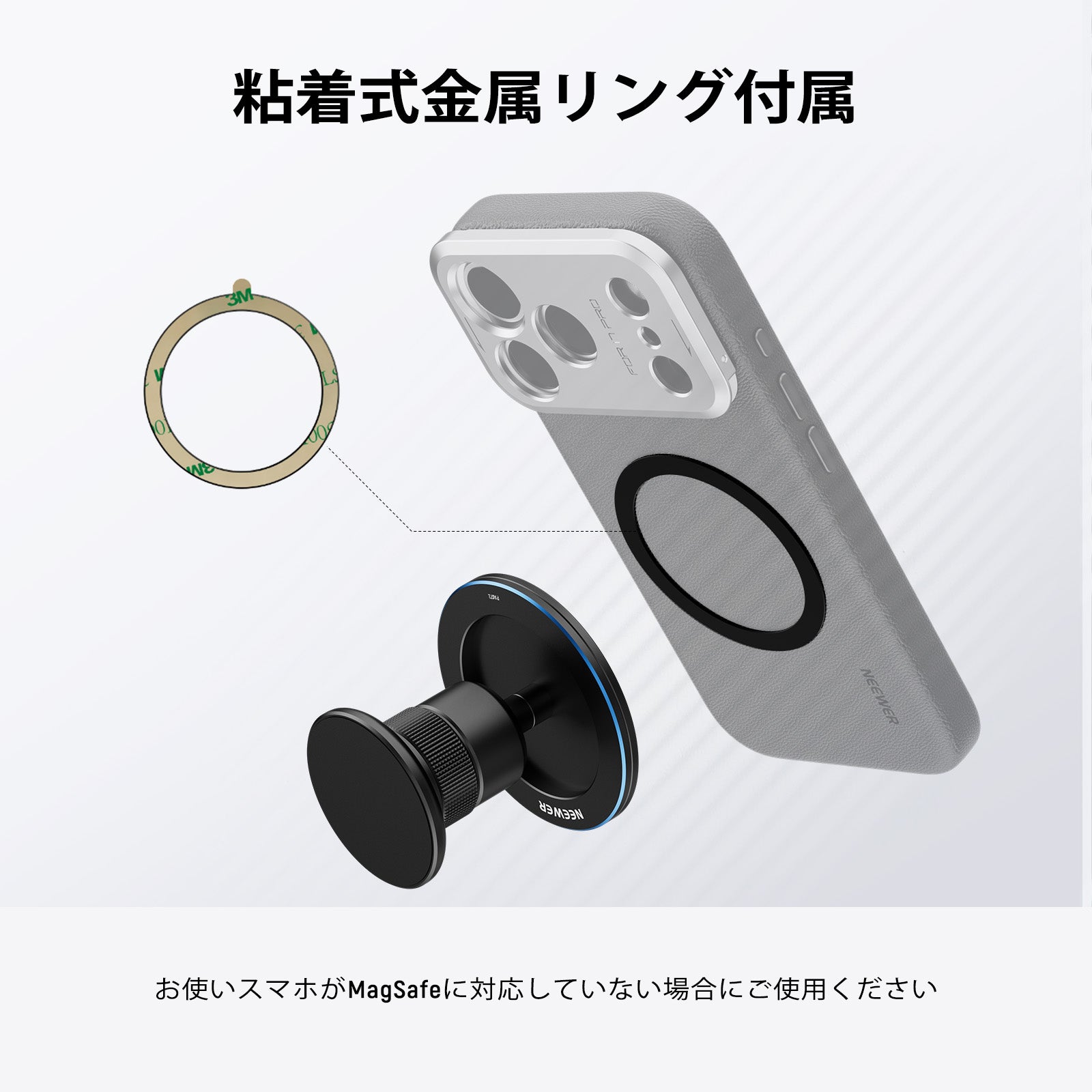 - 【粘着式金属リング付き】お使いのスマホがMagSafeに対応していない場合は(Galaxy S25 Ultra、Pixel 9 Proなど)、粘着式金属リングをスマホ/ケースに貼り付けることで、しっかりとマグネットで固定できます。