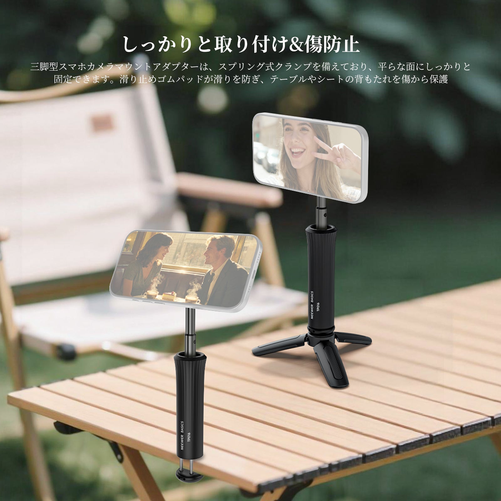 - 【しっかりと取り付け&傷防止】三脚式スマホカメラマウントアダプターは、バネ式クランプを備え、平らな面にしっかりと固定できます。滑り止めゴムパッドが滑りを防ぎ、テーブルや座席の背もたれを傷から守ります。