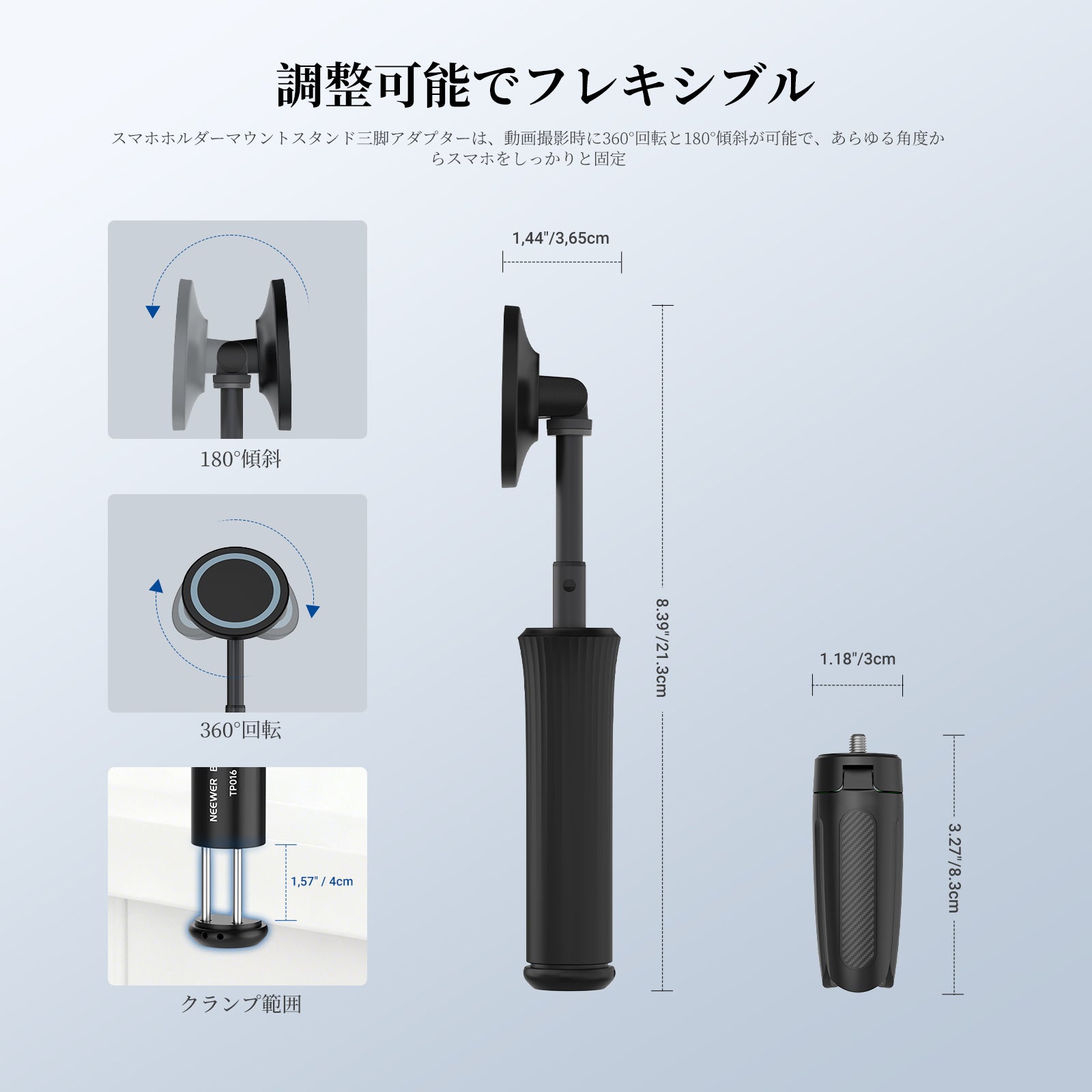 - 【調整可能&フレキシブル】iPhone用スマホホルダーマウントスタンド三脚アダプターは、20cm-29cmまで伸縮し、360°回転、180°チルトで動画撮影も可能です。あらゆる角度でスマホをしっかりと固定します。