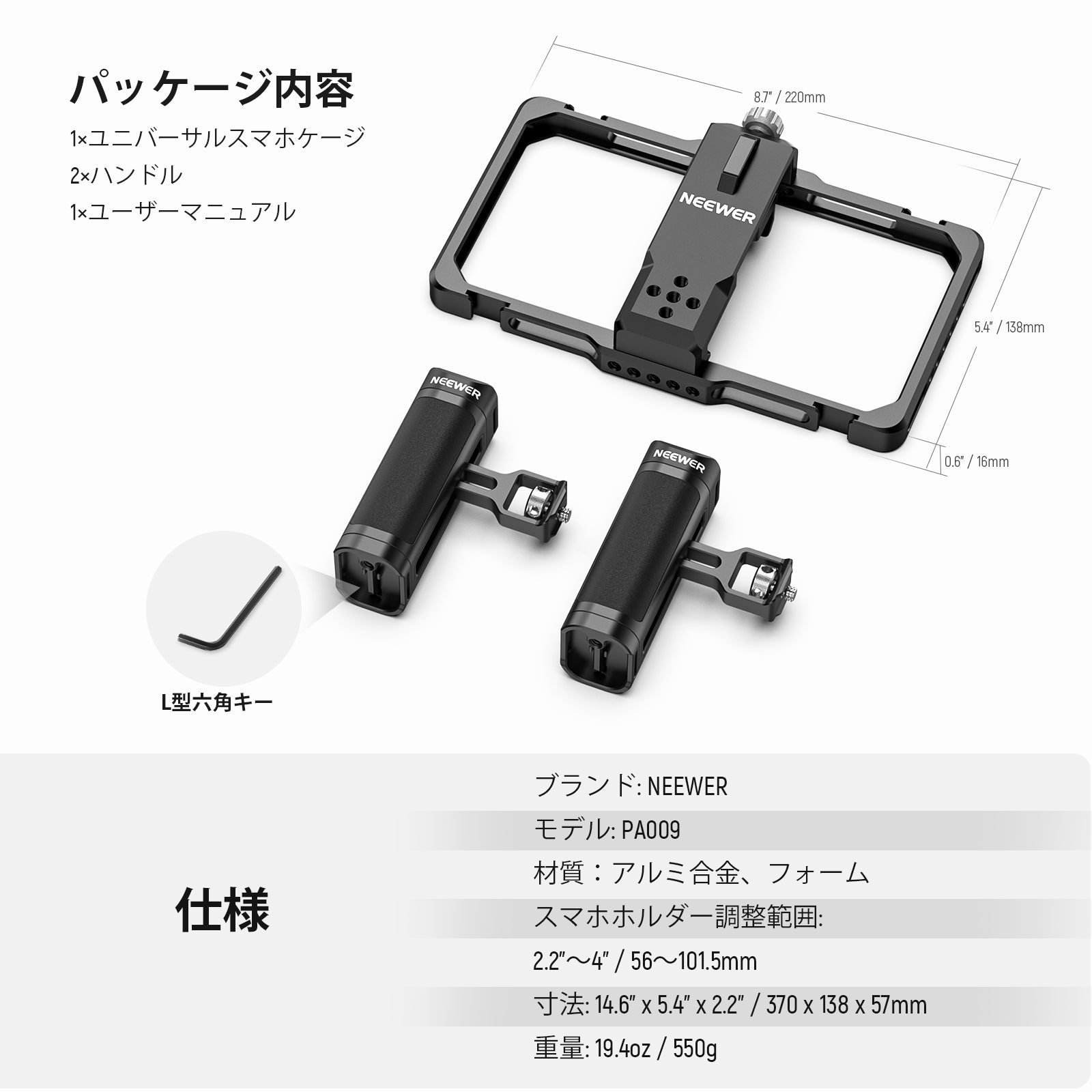 【人間工学に基づいたハンドヘルドデザイン】デュアルハンドルは、1本のネジでもたわみのない台形インターフェース設計のつまみネジでケージに固定され、フォームコーティングにより、安定した快適なハンドヘルド操作が可能です。L字型の六角キーを使用してハンドルを固定するか、ハンドルの位置を上下に調整して、最適なグリップ体験を実現します。