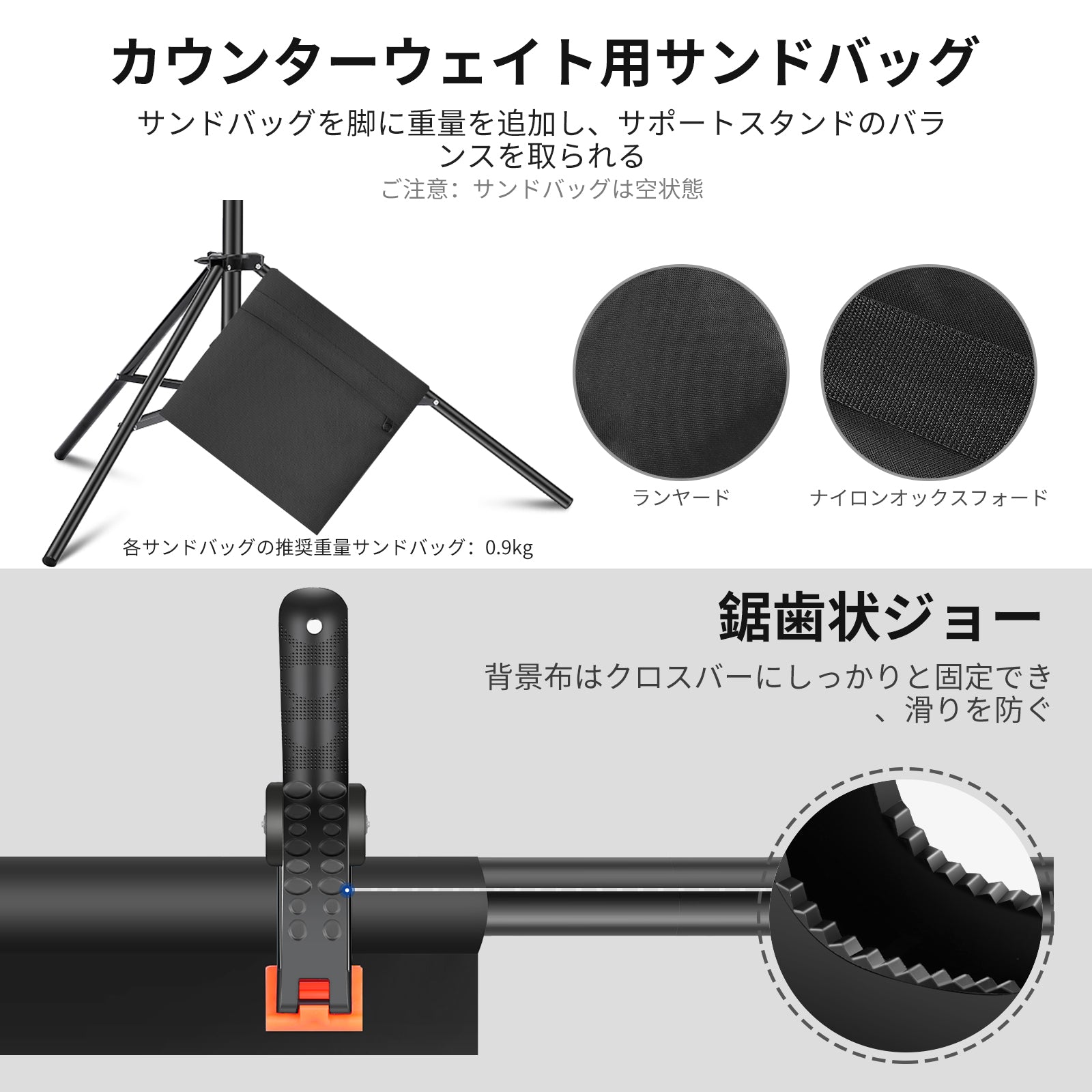 - 【安定した背景スタンド】アルミ合金製背景スタンドは4kgの耐荷重で、耐久と安定している。2つ空のナイロンサンドバッグは付属し、安定性を追加します。