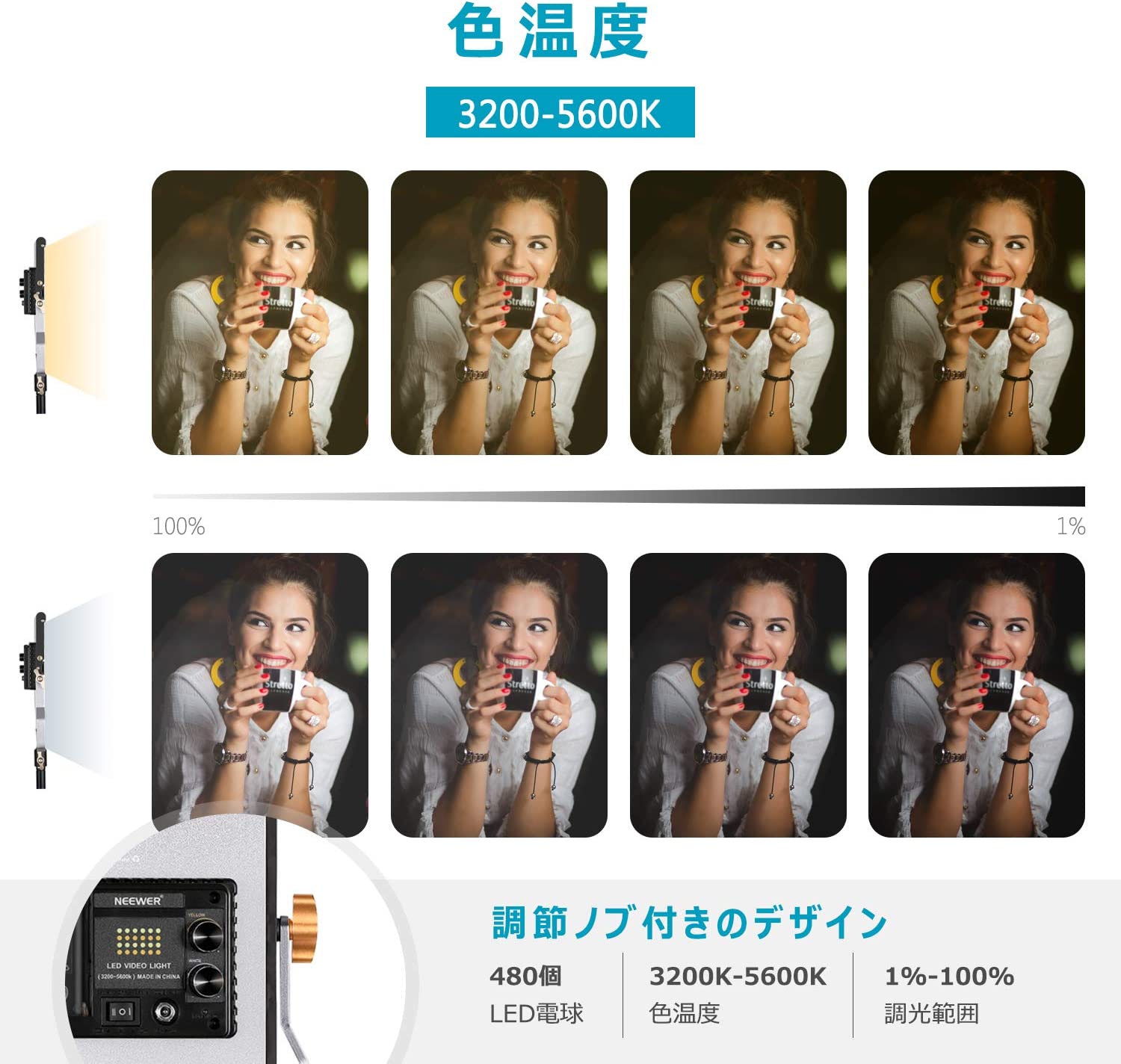 - 【プロ品質の高演色照明ライト】480 LEDパネルライトは、480個(白/黄各240)の高輝度LEDによる28W高出力設計で最大4000Lux/1mを実現します。CRI96+の高演色性で被写体の自然な色再現を可能にします。3200K~5600Kの広域色温度調整機能で、暖色から寒色まで瞬時に切替ます。1%の最低輝度から100%の最大輝度まで精密調光を実現します。Vlogger向け映像制作や商品写真撮影に最適な定常光ソリューションです。