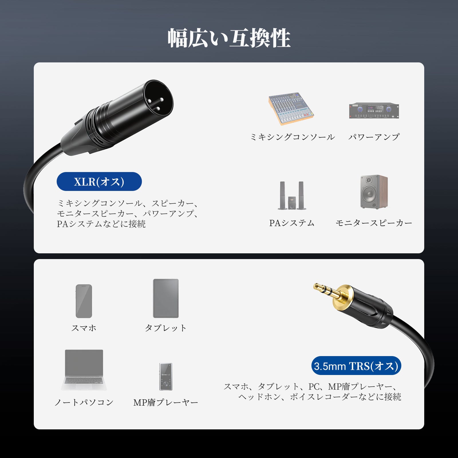 • 【3.5mm to XLR オスケーブル】XLR to 1/8インチ オスケーブルを使用して、スマホ、タブレット、ノートパソコンを、XLR オスコネクタ付きミキシングコンソールやパワードスピーカーに接続し、ステレオからモノラルへの信号伝送を効率よく実現します。