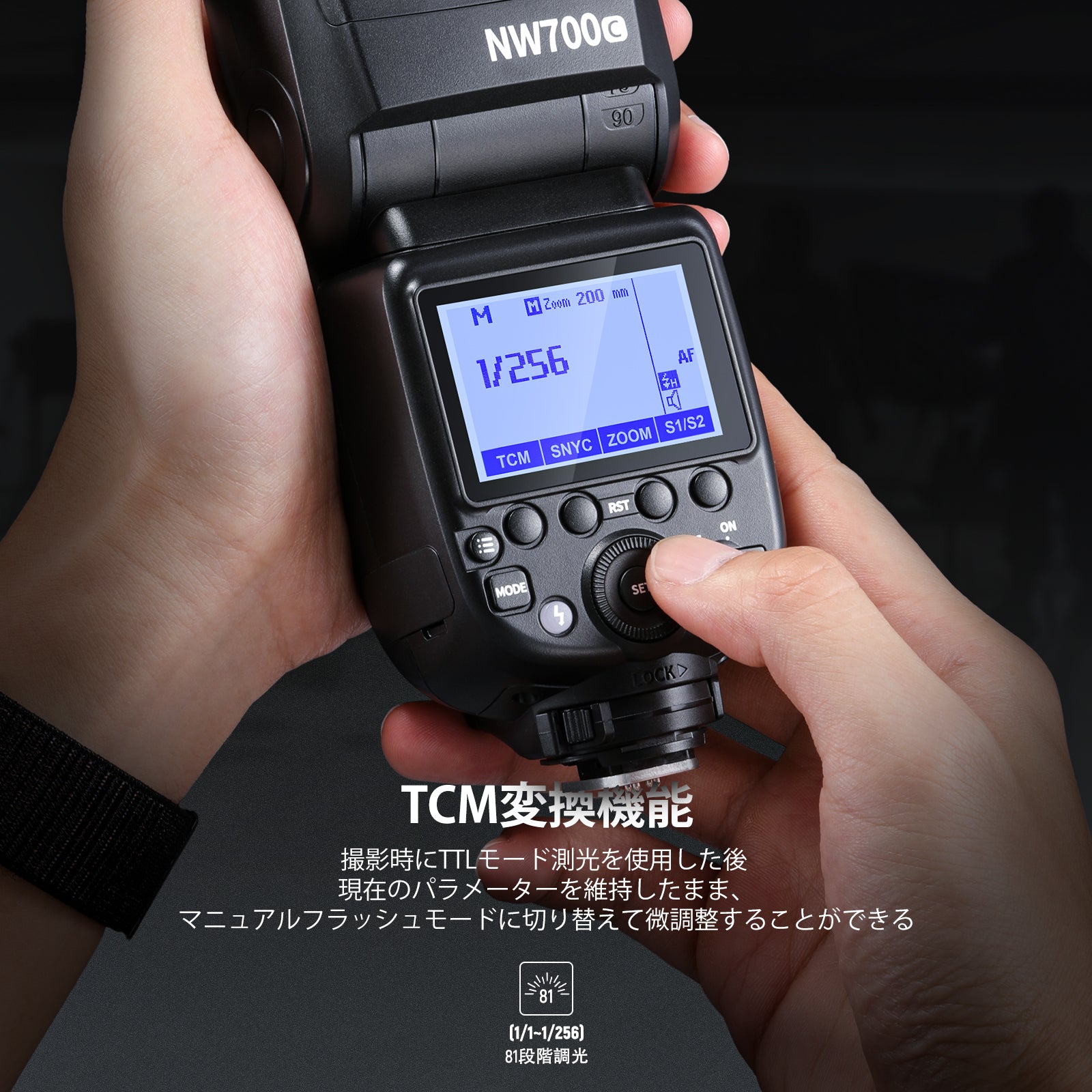 【高いガイドナンバーと注目のTCM機能】NW700-C はGN60の高いガイドナンバーを持ち、強力で安定した光を提供します。特徴的なTCM(TTLから手動への変換)機能は、TTLを使用して最初の測光を取得し、次にマニュアル フラッシュに変換して光量を微調整して正確な露出を得ることで、便利さと柔軟性を兼ね備えています。