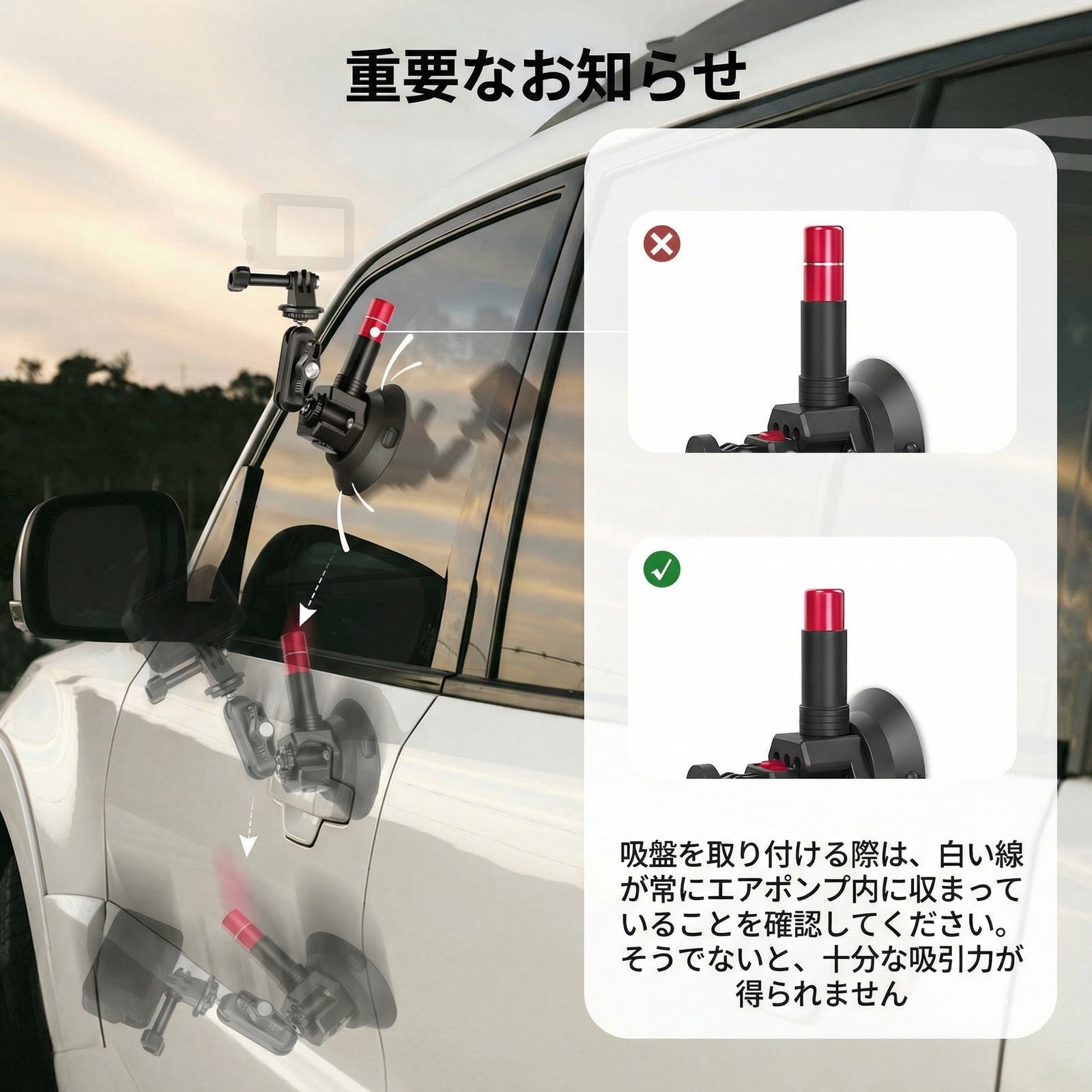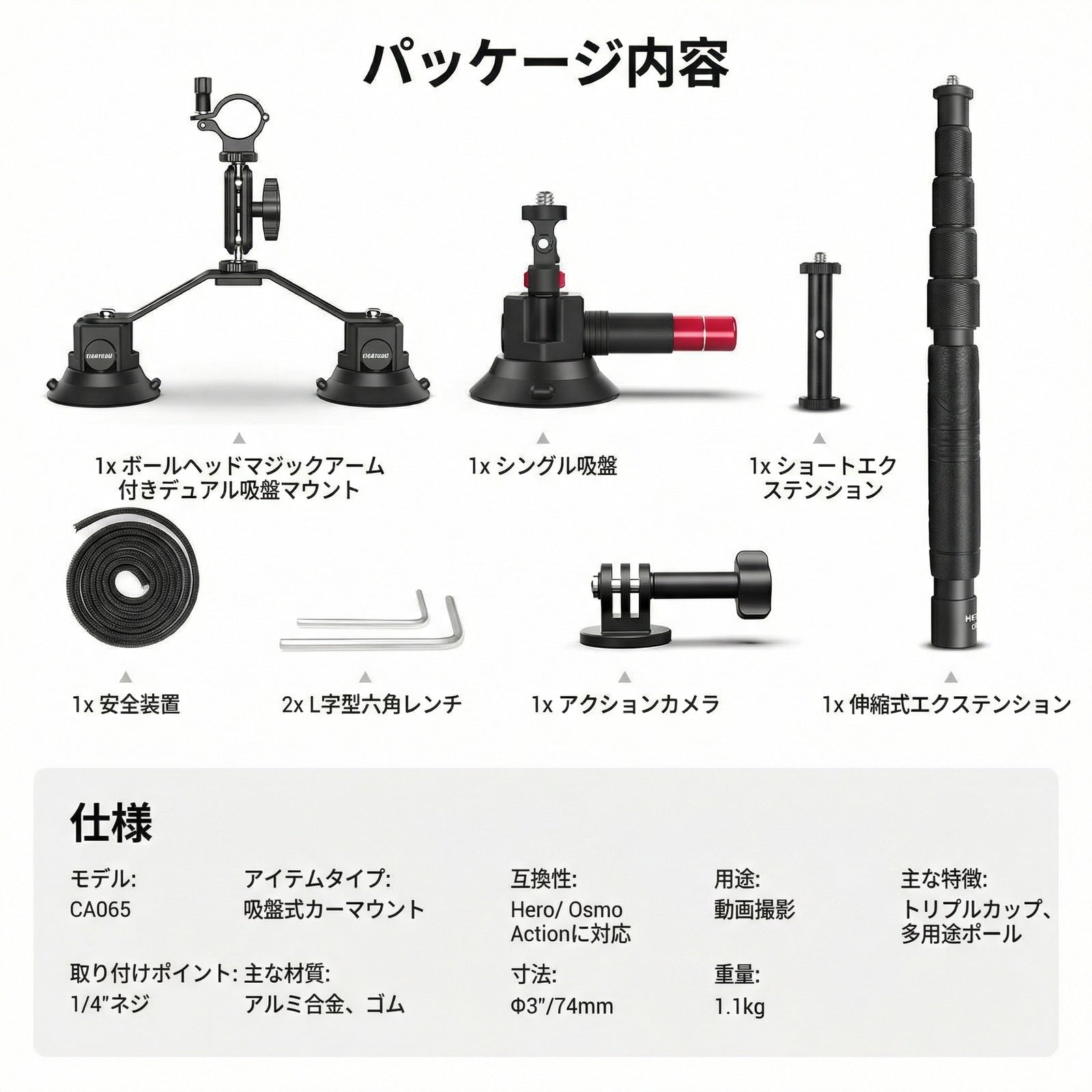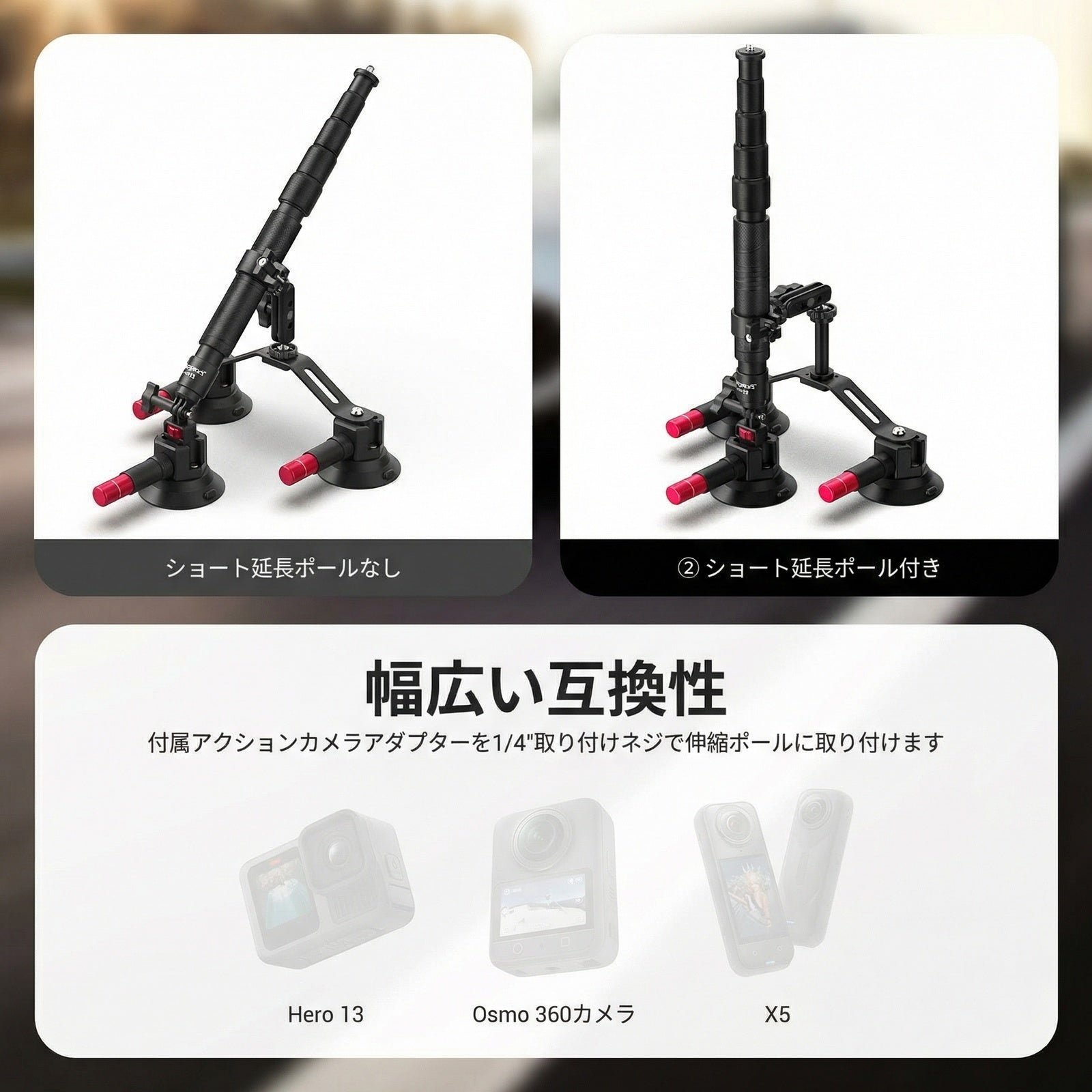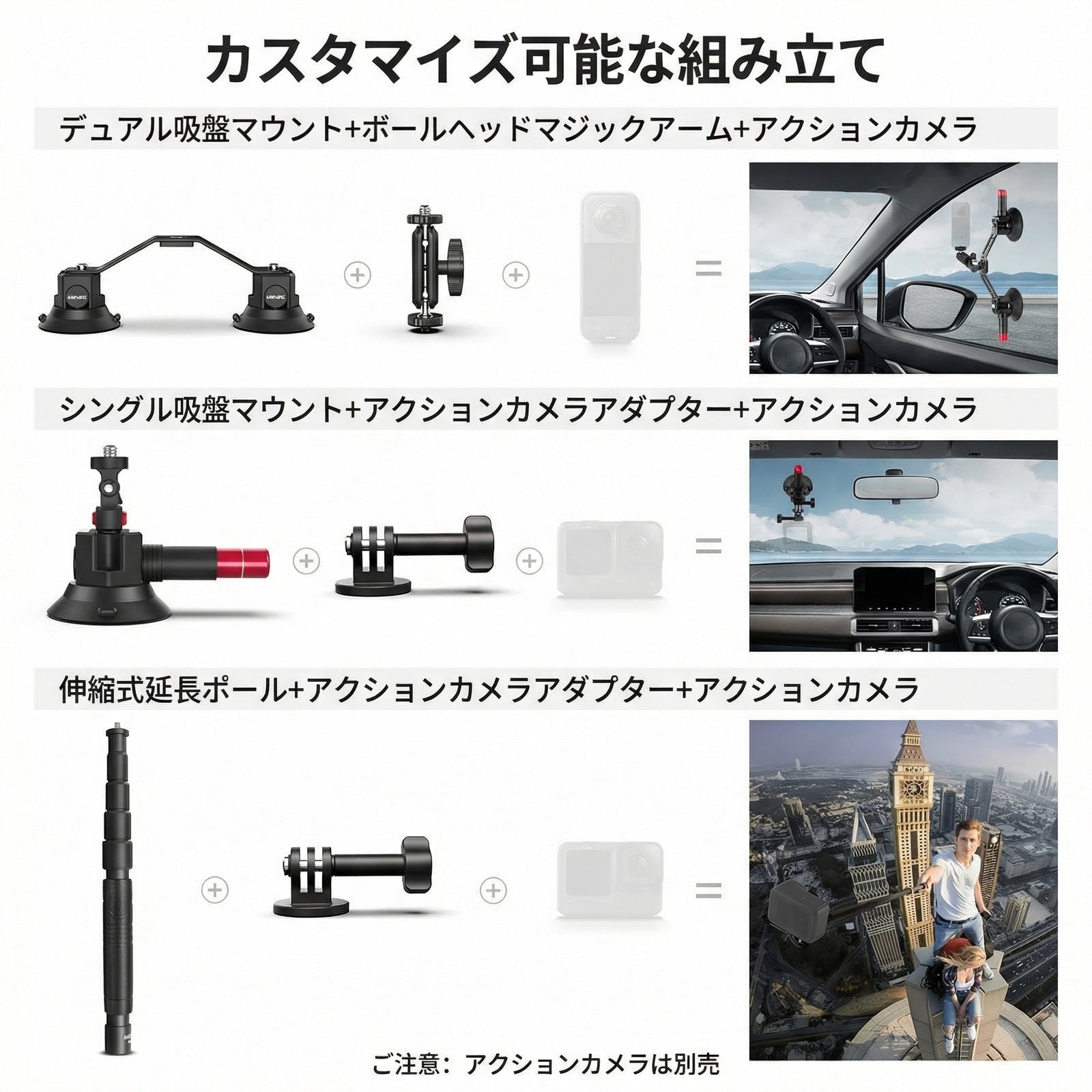 - 【トリプル吸盤カーマウントキット】エンジンフードやフロントガラス(内側/外側)、ダッシュボード、車体サイドなど、ユニークな運転視点から没入感あふれるPOV映像をキャプチャ可能。強力な3つの吸盤でアクションカメラを確実に固定するサクションマウントスタンドホルダーで、拡張ポールとボールヘッドマジックアームにより柔軟な位置調整が可能。安全対策としてセーフティーレーンも装備。落下防止のため、時速80km/h未満での使用をおすすめです。