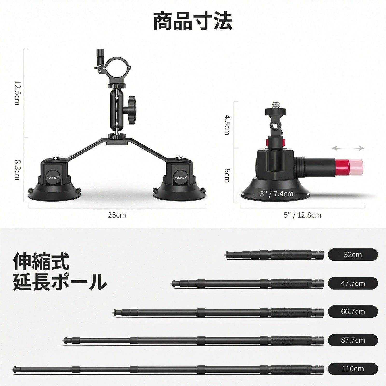 - 【多用途伸縮式延長ポール/自撮り棒】4段伸縮ポールは12.6"/32cmから43.3"/110cmまで伸縮可能で、1/4"ネジでシングル吸盤マウントに接続し、安定性のためにマジックアーム上の0.95"/24mm最大調整可能クランプで固定されています。コンパチブル iPhone 15 Pro Max Plus 14 13 12 Mini Galaxy Google Pixel (スマホホルダー別売)、多目的な自撮り棒としても使用できます。2.75"/7cmの短い延長ポールが汎用性を高めます。