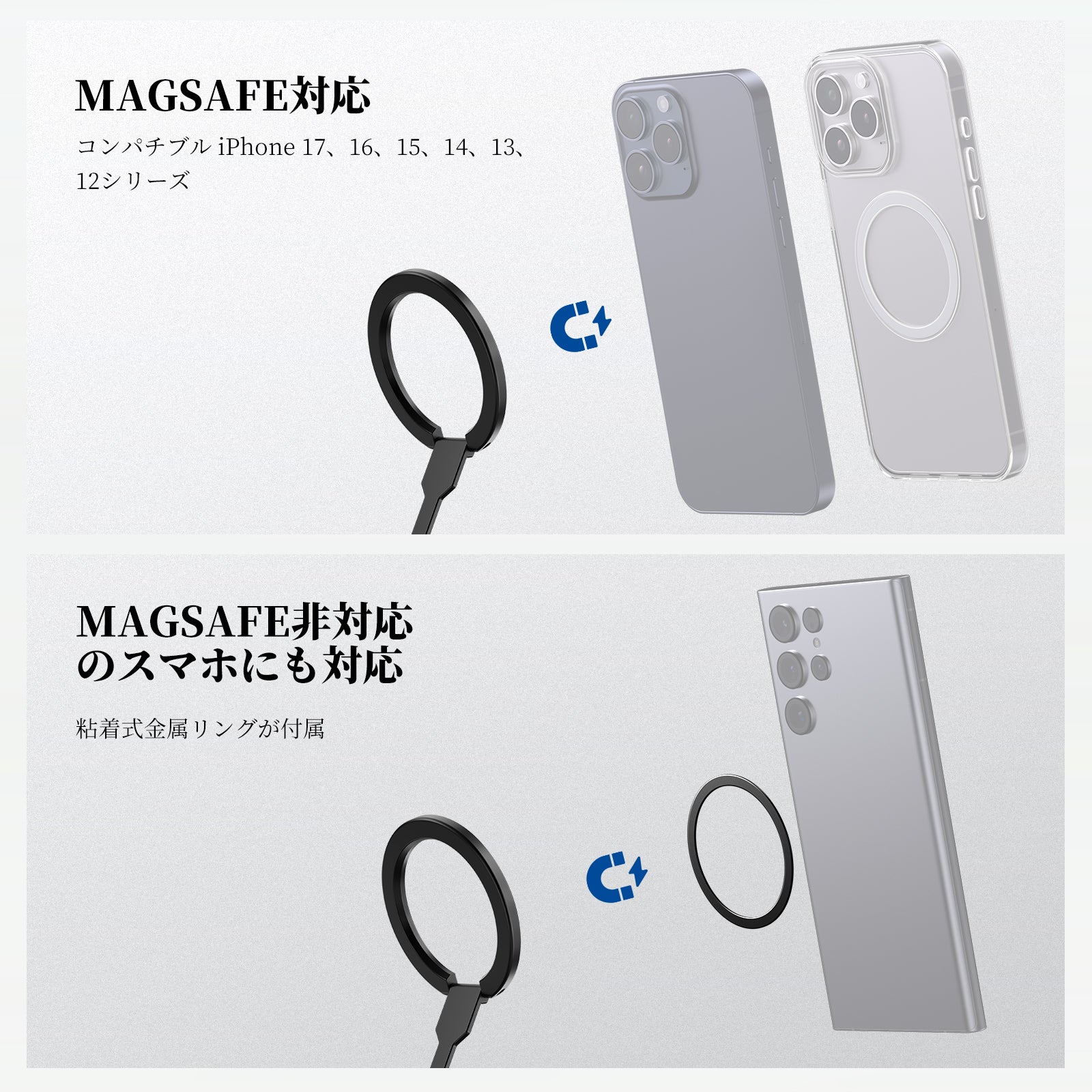 - 【マグネット式スマホマウント】卓上スマホホルダースタンドは、iPhone 17、16、15、Pro Max、Plus、14、13、12、MagSafeケース/カバー、POV撮影やスマホカメラ動画撮影用アクセサリーに対応しています。マグネットリング付きフィンガーリングスナップグリップキックスタンドアタッチメントとして、Galaxy S25、S24 Ultra、Google Pixel 10、9 Proなどに対応しています。