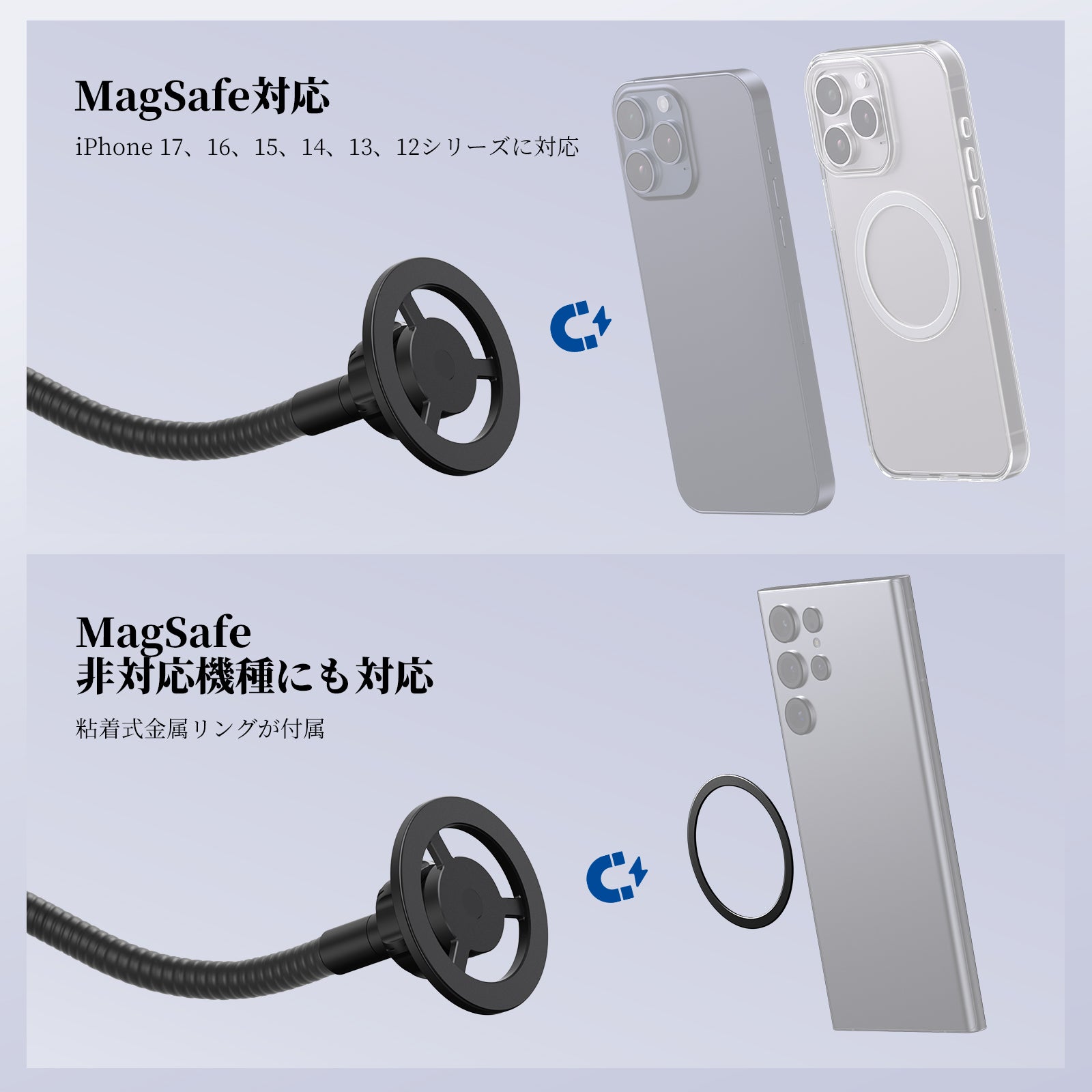 【汎用スマホホルダー】マイクスタンド用スマホクランプホルダーは、65-95mm範囲で調整可能で、iPhone 16、15、Pro Max、Plus、16e、iPhone 14、13、12、Galaxy S25、S24、S23 Ultra、Pixel 9、8、7 Proなどに対応し、縦横どちらの撮影にも対応しています。滑り止めパッドが傷からスマホを保護し、コンテンツクリエイターにとって必要なスマホカメラ撮影アクセサリーとして、インフルエンサーにとって必要なビデオ撮影ギアとして最適です。