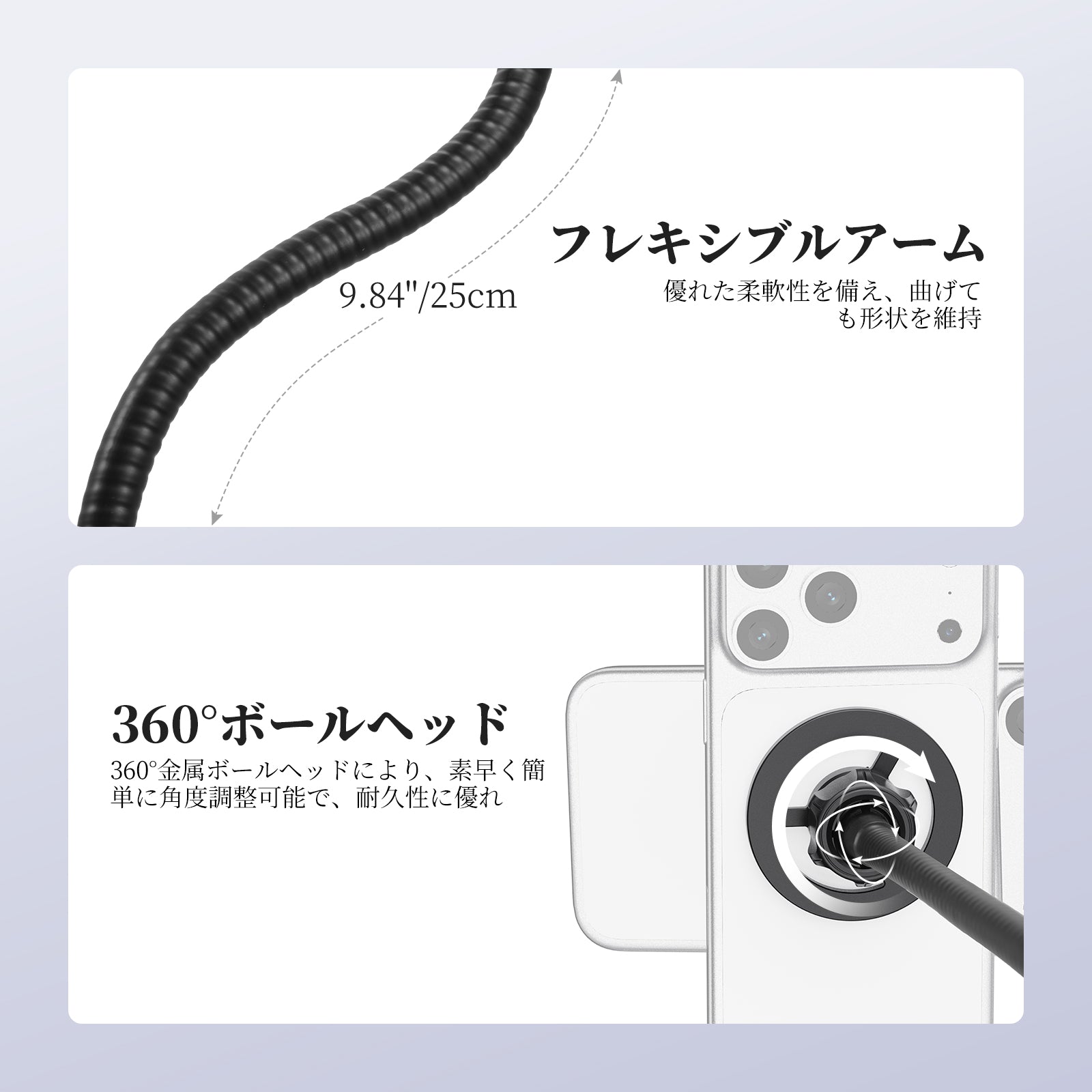 - 【柔軟でスムーズな調整】長さ20cmフレキシブルブームポールアームは優れた適応性を備え、曲げても形状を保ちます。上部には360°回転可能なボールヘッドが付いており、スマホをあらゆる角度や高さでしっかりと固定できます。スピーチ、会議、カラオケ、ステージでの歌唱、バンド演奏、スタジオ録音、生放送、オンライン授業など、どんな場面でもクリップ式スマホスタンドホルダーはいつでも手の届くところにあります。