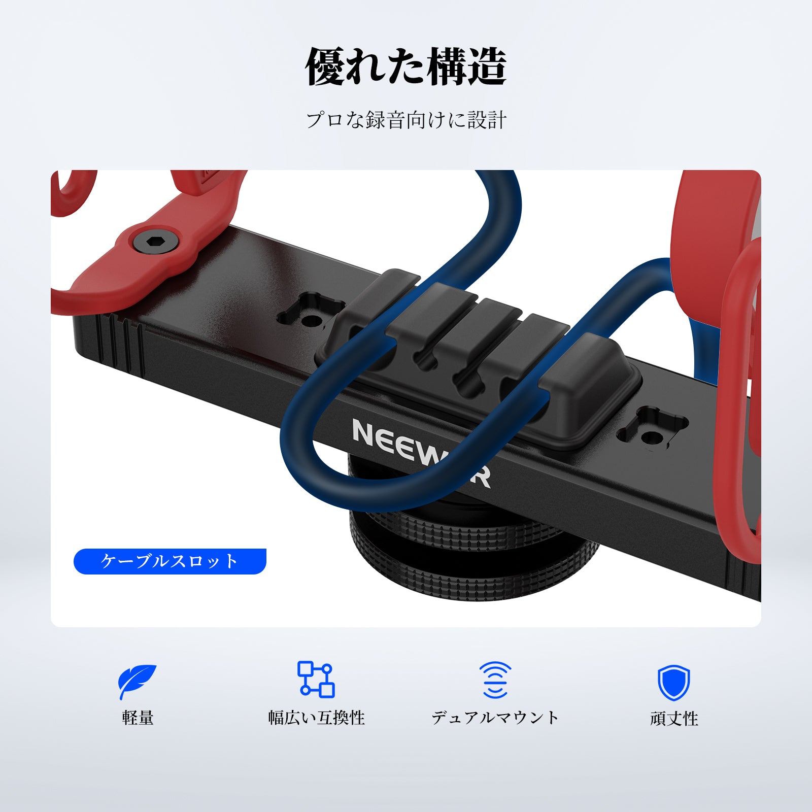 - 【ケーブルマネジメントスロット】屋内外の録音時にケーブルを整理したり固定したりして、ケーブルの乱雑さや干渉を防止します。