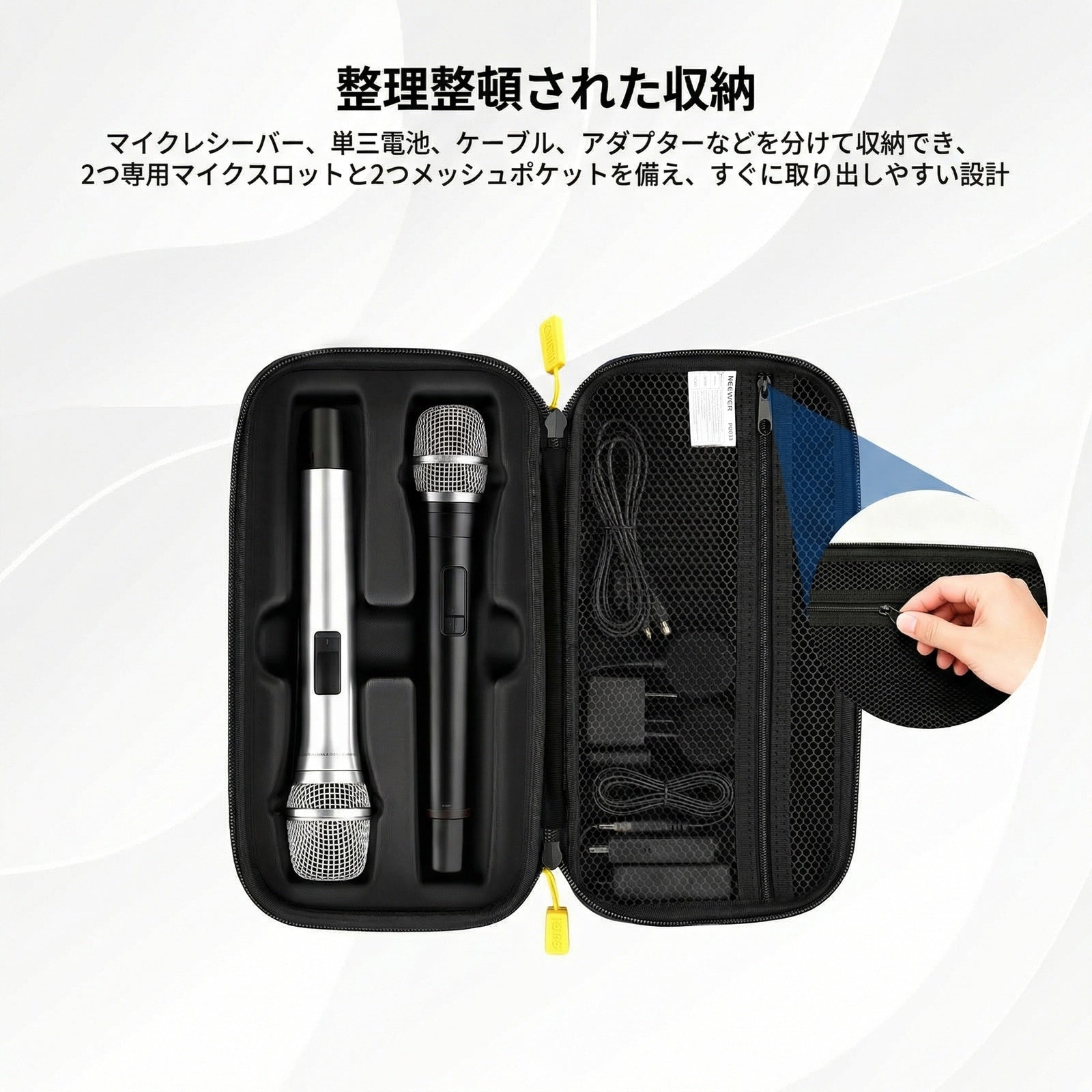 - 【整理整頓された収納】マイクケースには、2つマイクスロット、2つメッシュポケット、面ファスナーとフックファスナーが付属しており、マイクレシーバー、単3バッテリー、ケーブル、アダプターをきちんと分けて収納でき、すぐに取り出せます。