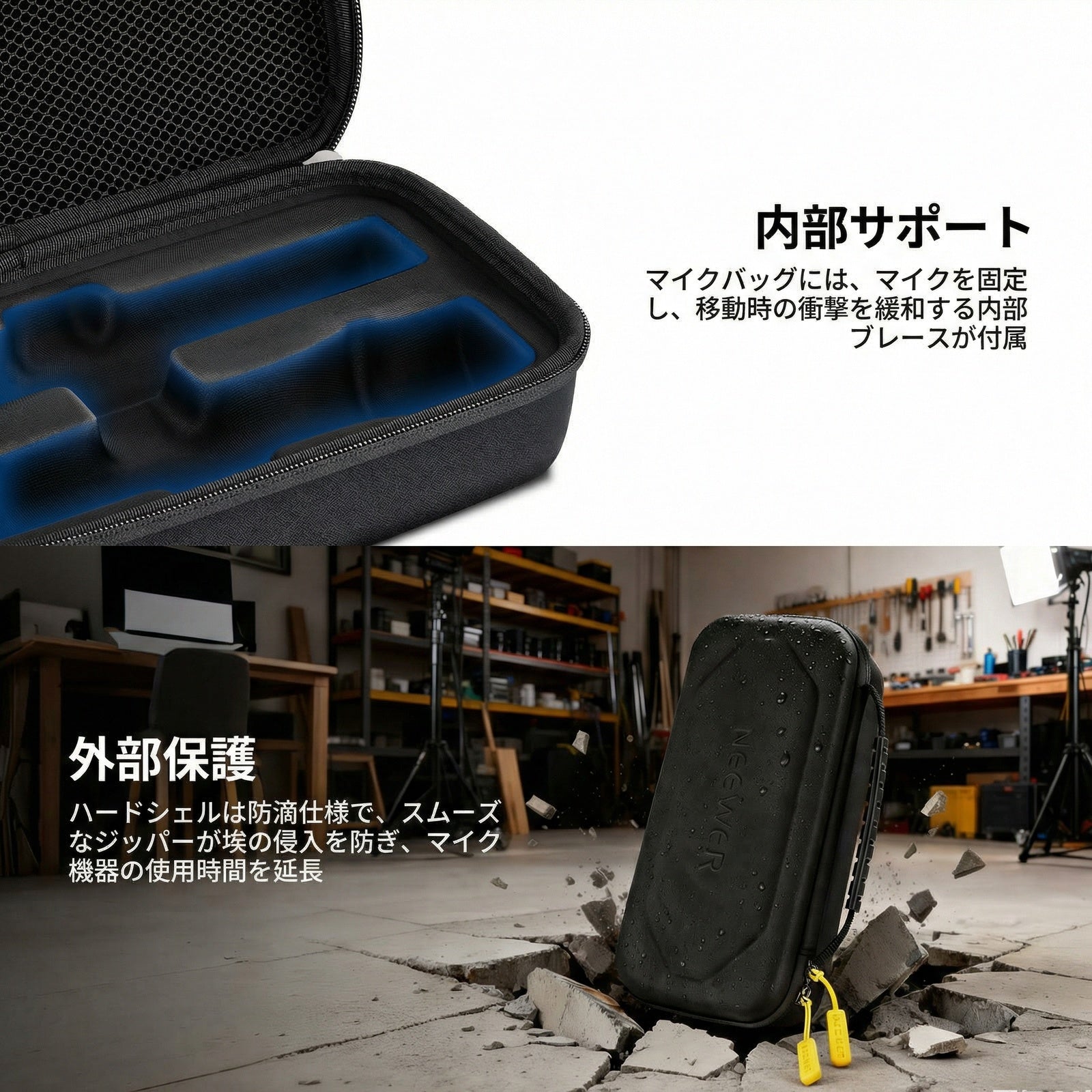 - 【全面な保護】マイクバッグには、マイクを固定し、移動時の衝撃を緩和する内部ブレースが付いています。ハードシェルは防水仕様で、滑らかなジッパーはほこり侵入を防ぎ、マイク機器の使用時間を延ばします。