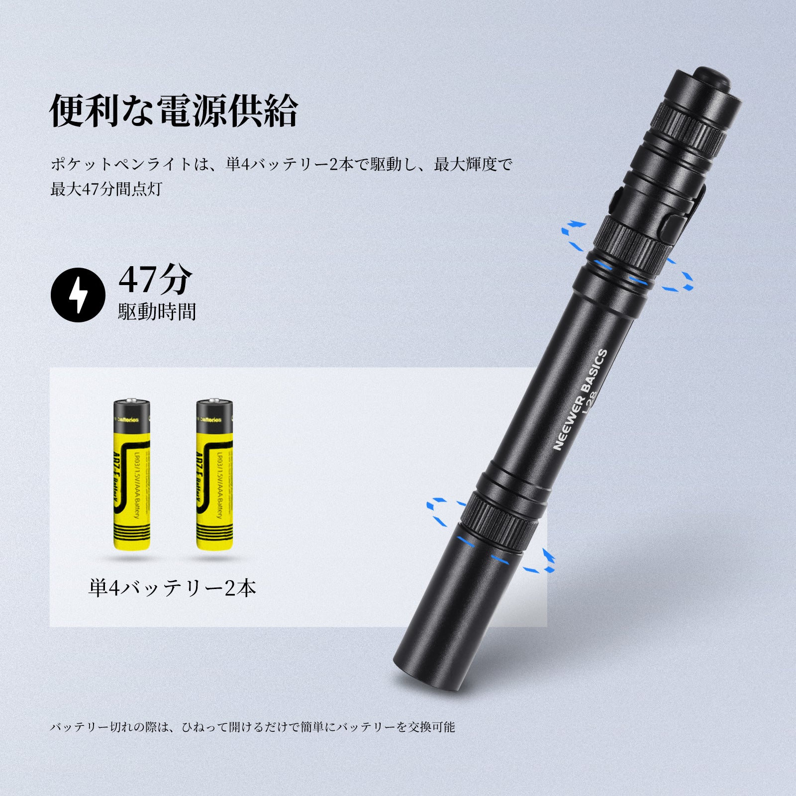 【シンプルな電池式で手軽な運用】単4電池2本で動作するコンパクトペンライトは、最大輝度で約47分間の連続点灯が可能。電池交換もワンタッチで簡単。本体をひねるだけでカバーが開き、すぐに新しい電池に交換できます。
