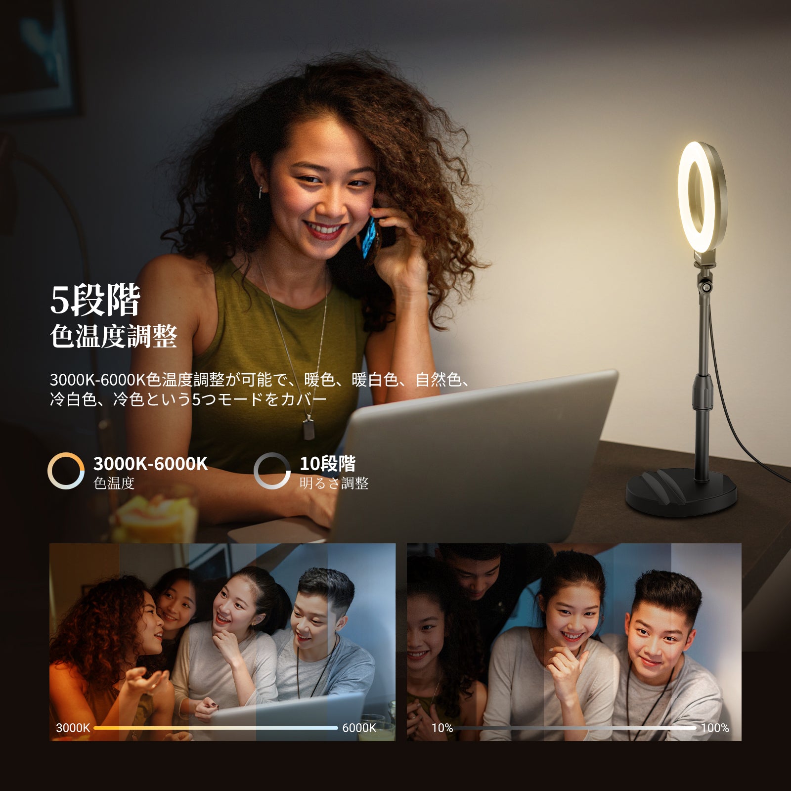 • 【多様な設置方法で使いやすい】デスクスタンド付きLEDリングライトは、高さ29~45cmまで自由調整可能で、180°の角度調節が可能。付属のモニタークランプを使用すれば、パソコンやノートPCにも簡単に取り付けられ、Zoom会議やビデオ通話、ポッドキャスト収録、メイクアップ作業など、様々なシーンで柔らかな照明を提供します。