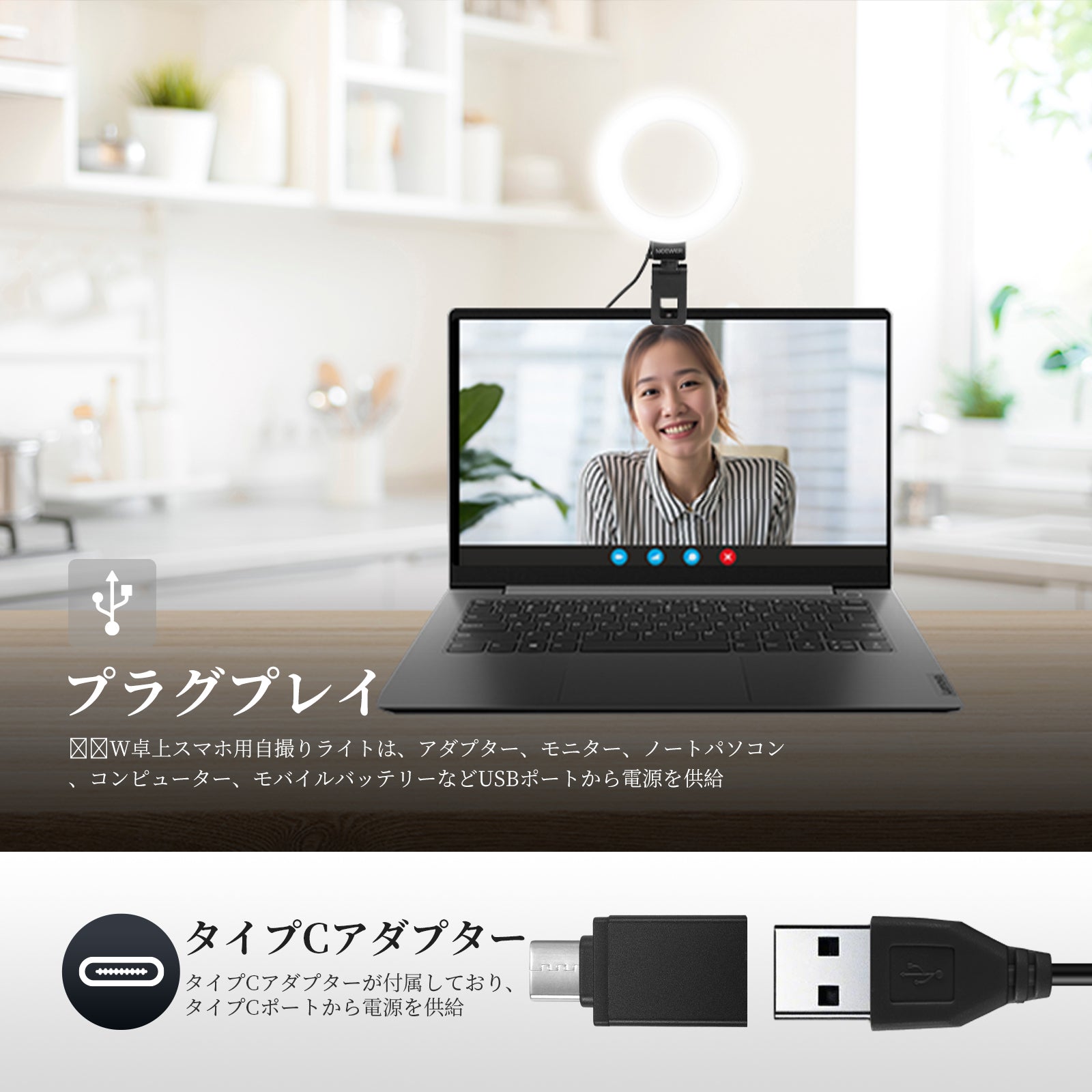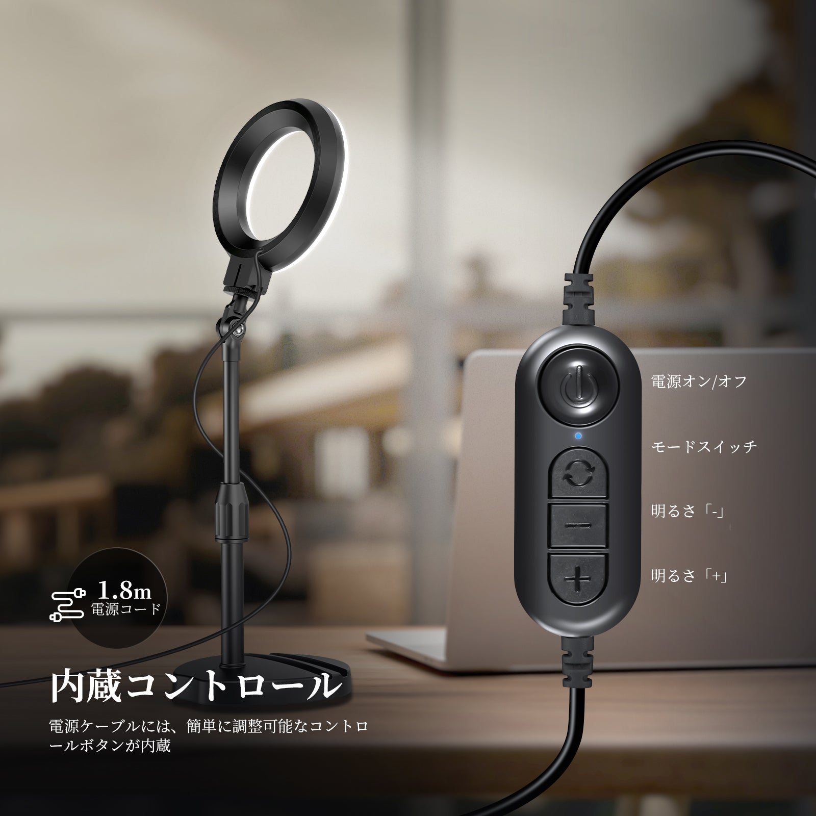 • 【USB給電対応】 LED卓上リングライトは、5V/2Aでの動作に対応し、約1.8mの内蔵電源ケーブルでUSBからの手軽な給電が可能。コンパクトな5インチサイズで携帯性に優れ、日常のコンテンツ制作や屋内・屋外を問わない動画収録に、安定した照明環境を提供します。