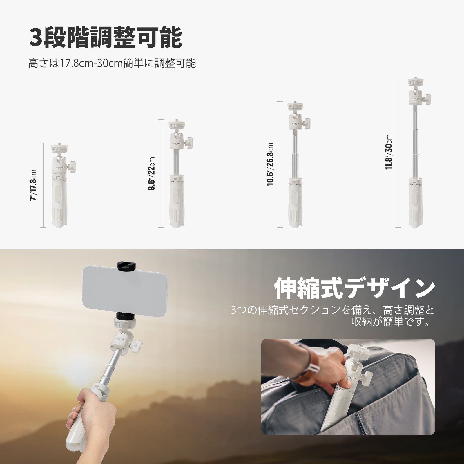 - 【簡単な高さ調整と高い中心軸】3セクション中心軸付き三脚の脚は、7.8cmから11.8cmまで簡単に調整できます。柔軟な卓上や手持ち式三脚は、コンパチブル iPhone、優れた撮影をできます。滑り止めゴム足は、どんな表面でもしっかりとグリップし、安定した撮影を実現できます。