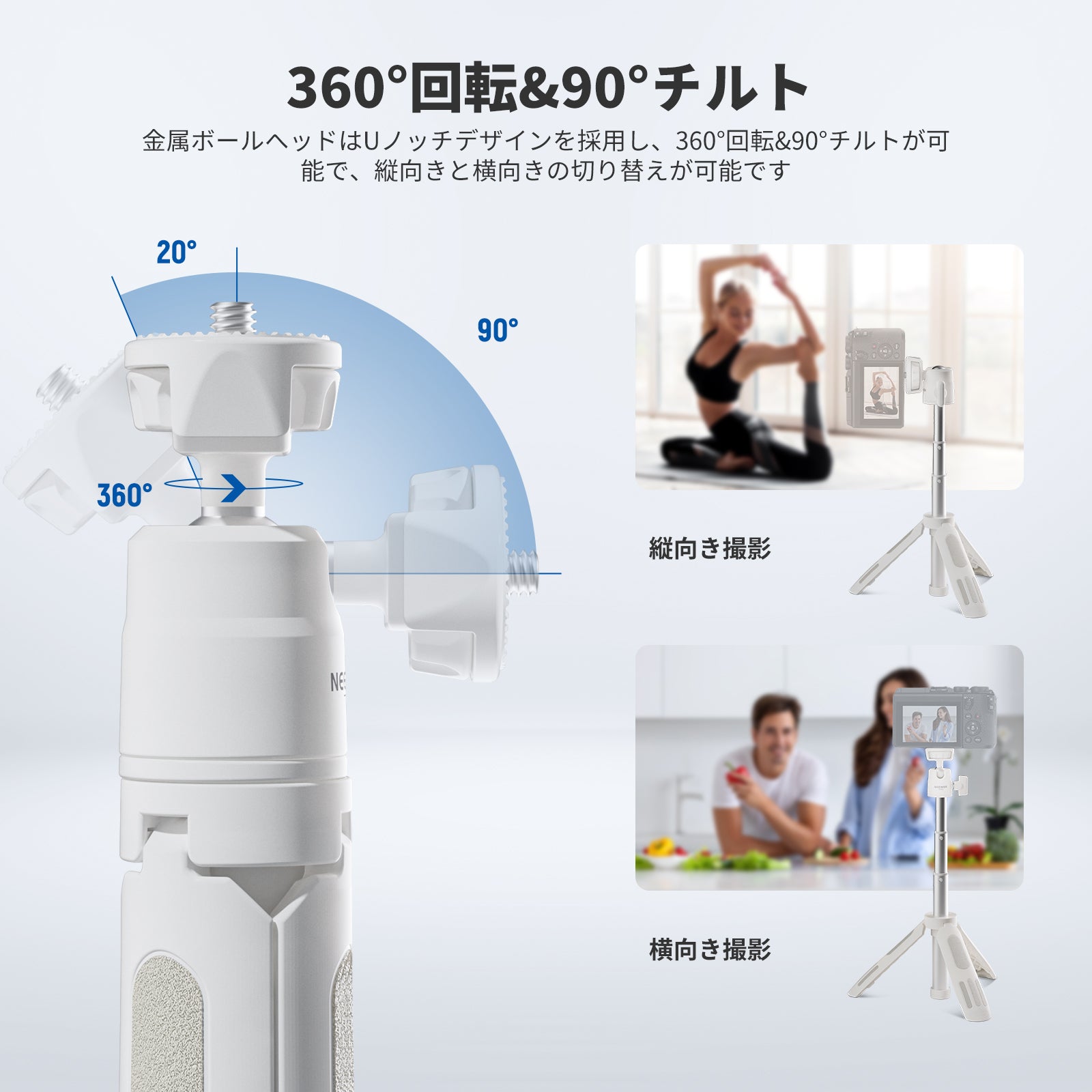 - 【360°回転&90°チルト】金属製ボールヘッドのシングルUノッチ設計は、360°水平回転と90°垂直回転が可能になり、柔軟かつ安定しています。俯瞰、低角度、垂直、水平撮影に適しています。ロックノブを回転させ、任意の角度でデバイスを固定できます。