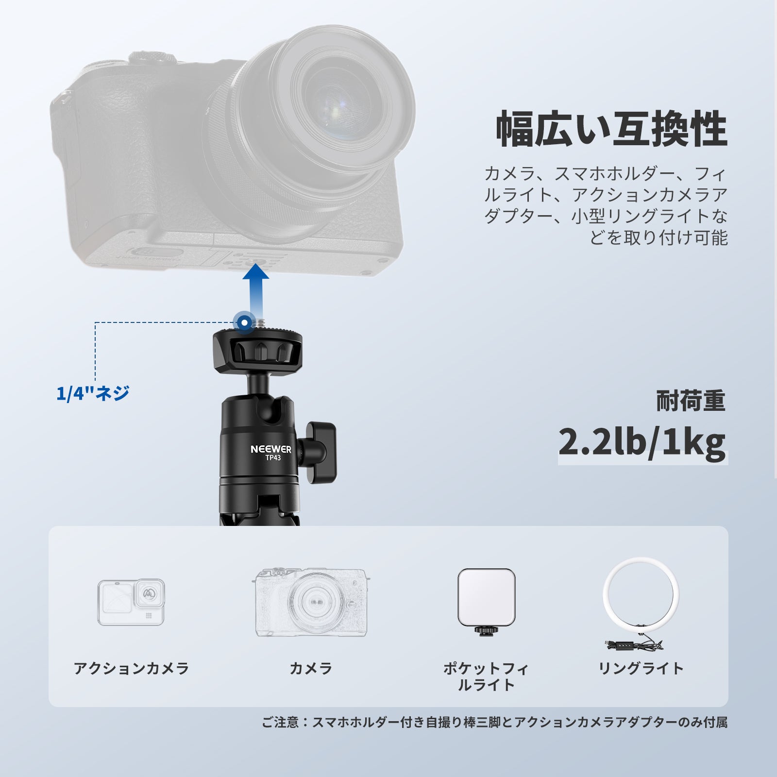 - 【ミニ卓上自撮り棒三脚】ミニ三脚は、完全に伸ばして自撮り棒として機能でき、また卓上三脚スタンドとして使用したり、手持ちで安定したグリップとして使用したり、グリップモードとスタンドモードを素早く切り替えます。小型ポケットカメラ三脚は、プレミアムアルミ合金で作られ、上部1/4"ネジでアクションカメラやスマホ(スマホホルダーとアクションカメラアダプターが付属)をサポートし、ビデオブログ、生放送、ビデオ録画、映画制作などに最適です。最大荷重1kg。