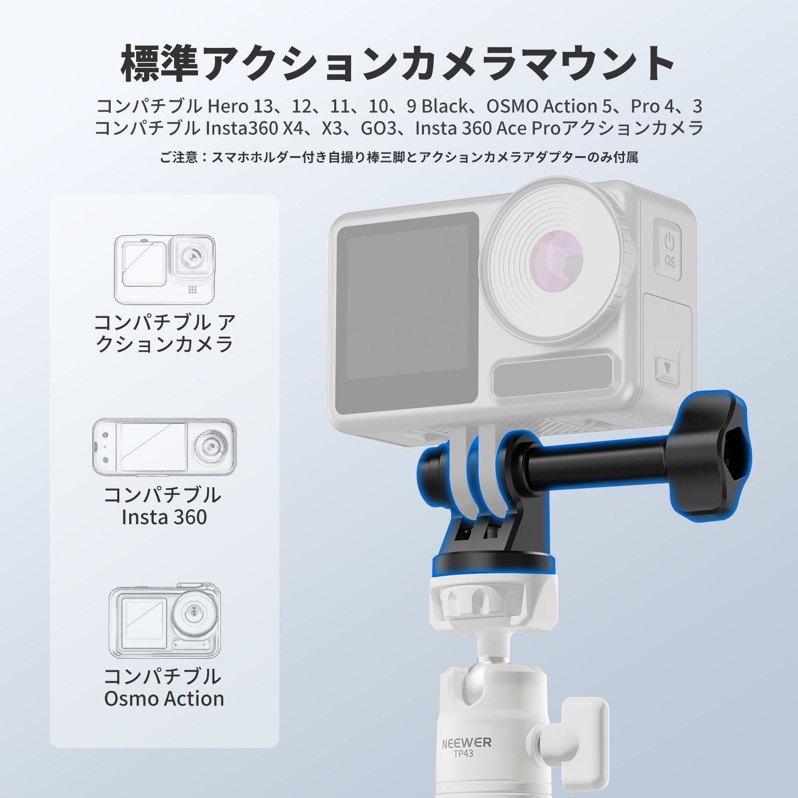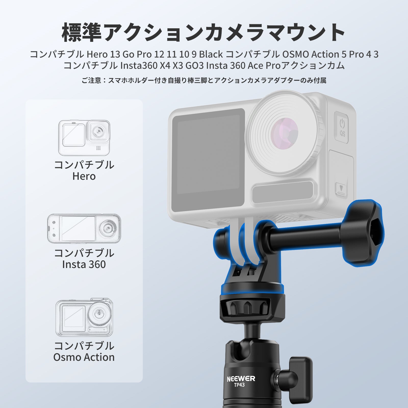 - 【スマホとアクションカメラ用三脚】調節可能なスマホホルダークリップは、コンパチブル iPhone 16 15 Pro Max Plus 14 13 Galaxy S24 S23 Ultra Google Pixel 9 8 7 Pro Androidスマホ、1つのコールドシューが付属し、モニター、フィルライト、マイクのような撮影アクセサリーやギアを取り付けられます。マウントアダプターはコンパチブル Hero 13 Go Pro 12 11 10 9 Black 、コンパチブル DJI OSMO Action 5 Pro 4 3、コンパチブル Insta360 X4 X3 GO3 Insta 360 Ace Proアクションカメラ。