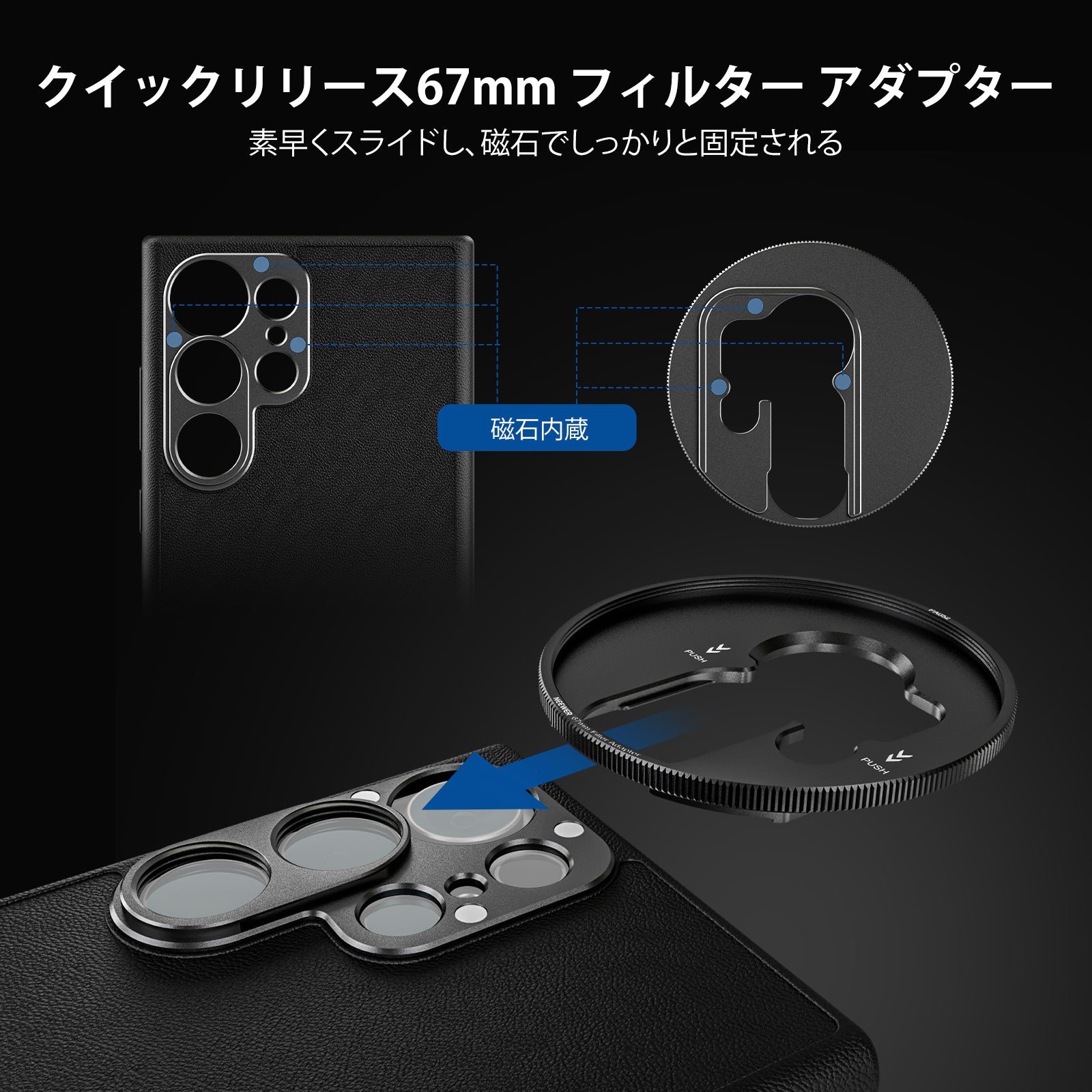 - 【クイックリリース67mmフィルターアダプター】Galaxy S24 Ultra用スマホアクセサリーキットには67mmフィルターアダプターを付属し、ND、CPL、ブラック拡散、光害、グラデーションフィルターなど汎用67mmフィルターを接続できます。芸術的、映画的、表現力豊かな撮影が可能です。素早くスライドし、マグネットでしっかりと固定できます。