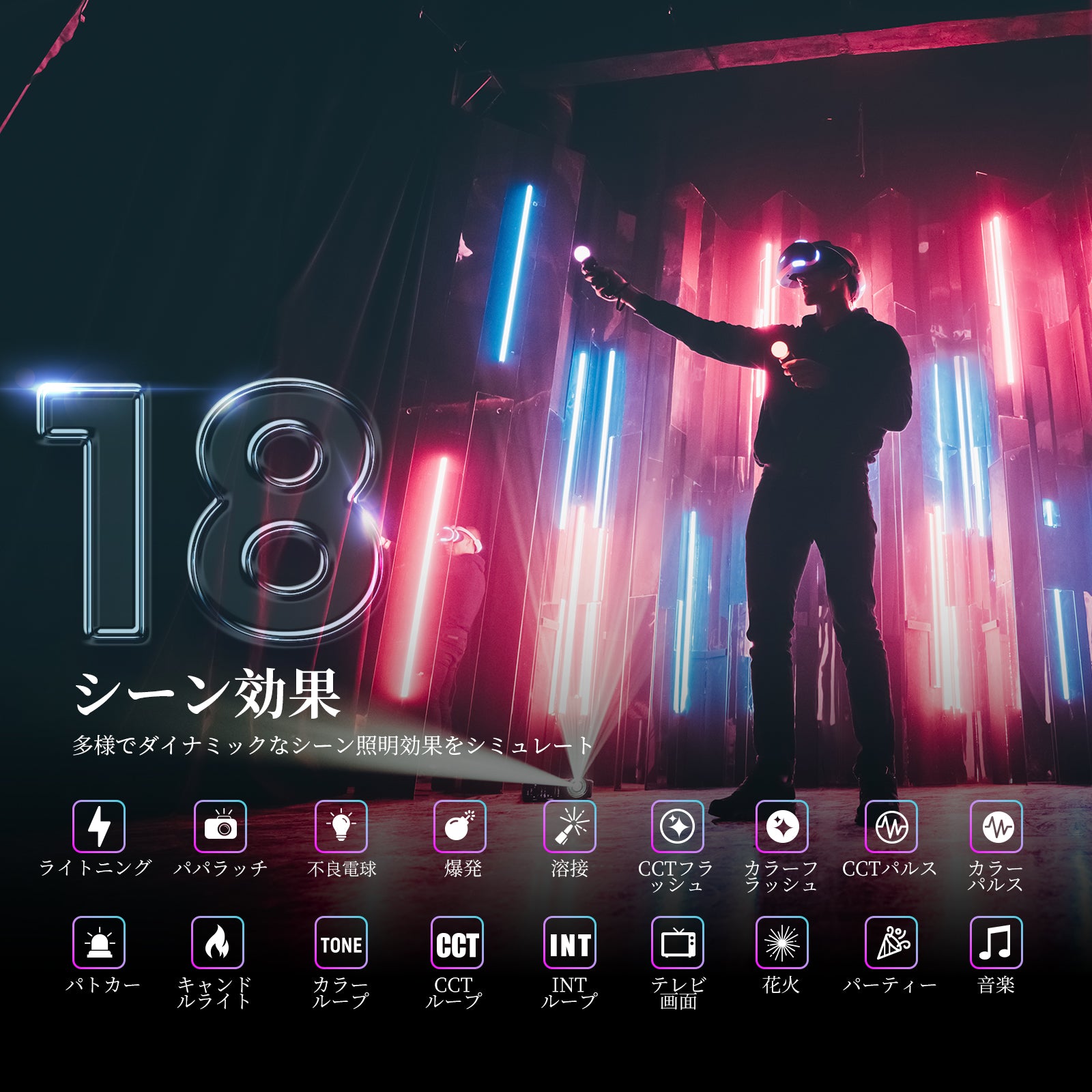 - 【豊富なカラー調整と18種類のシーンエフェクト】HSIモードでは、カラーホイール、彩度、明るさを調整することで、36,000色の光にアクセスでき、RGBタッチバーの上を指でスライドさせることで簡単に変更できます(注:誤って起動しないようにロックボタンが設計されています)。さらに、シーンモードは18種類のリアルなシーンエフェクトで、あなたの革新的なビデオ制作を大幅に強化します。RGBライトスティックにはLCDがあり、直感的なパラメータ設定が可能です。