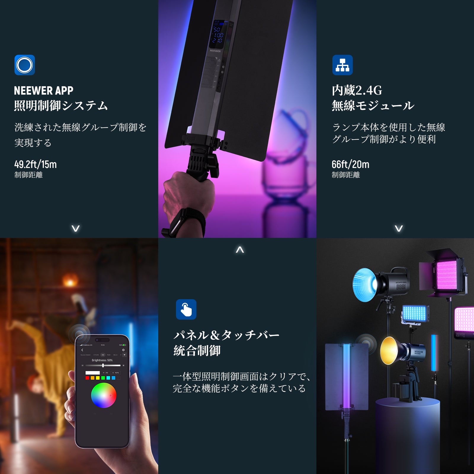 【NEEWERの詳細を見る】NEEWERAPPまたはワイヤレス2. 4Gでグループ管理する場合、RGB2 LEDライトワンドは、AS600B、CB300B、CB300、CB200B、CB200C、CB200、CB150、CB100C、CB100を含む様々なNEEWER LEDスタジオライトと組み合わせることができます、 CB60RGB、CB60B、CB60PRO、CB60、MS230C、MS150C、MS150B、MS150、MS60C、MC60B、MC60、FS230B、FS230、FS150B、FS150、TL120C、TL90C、TL60 RGB、BH30S、RGB 1200、PL60C、AP150Cなど。