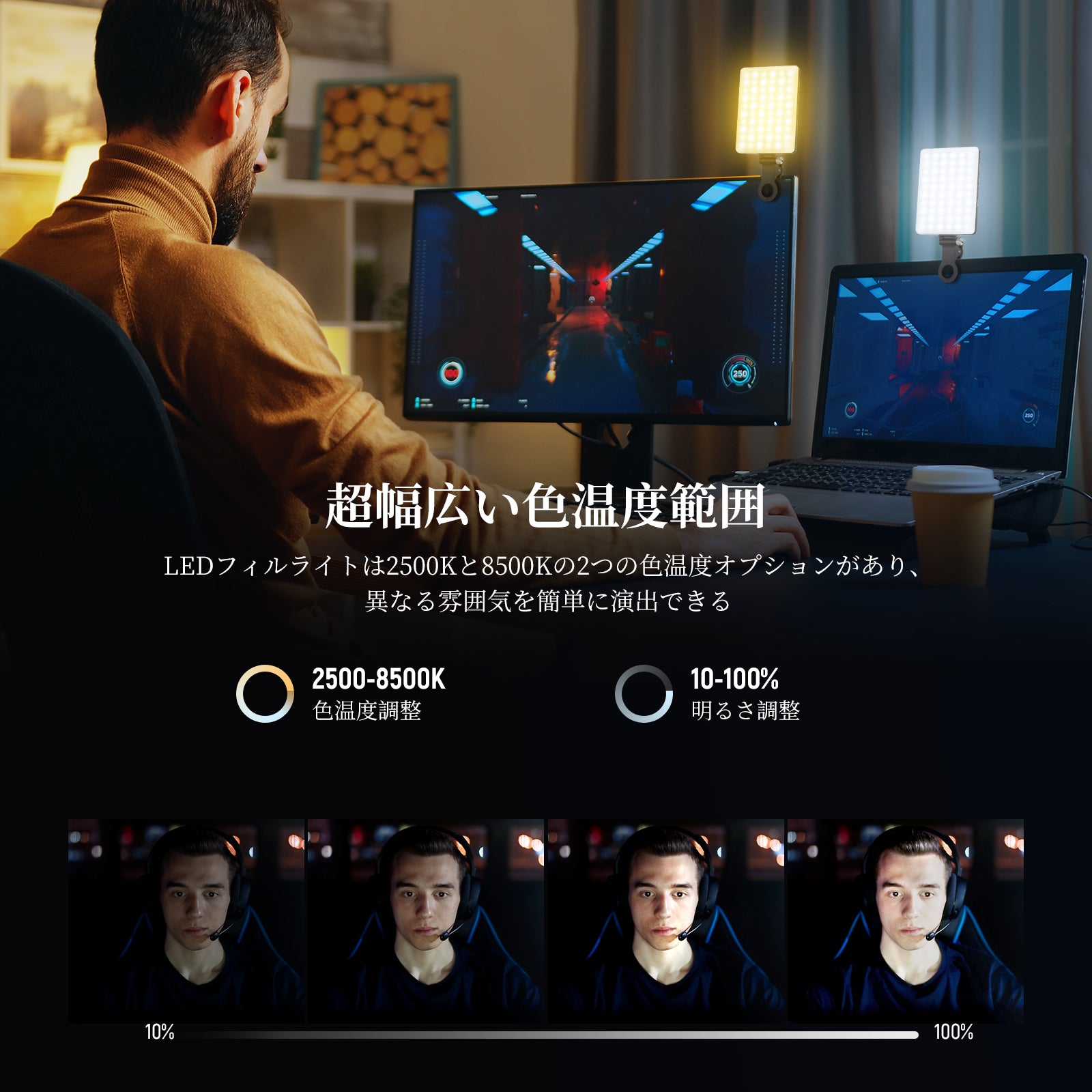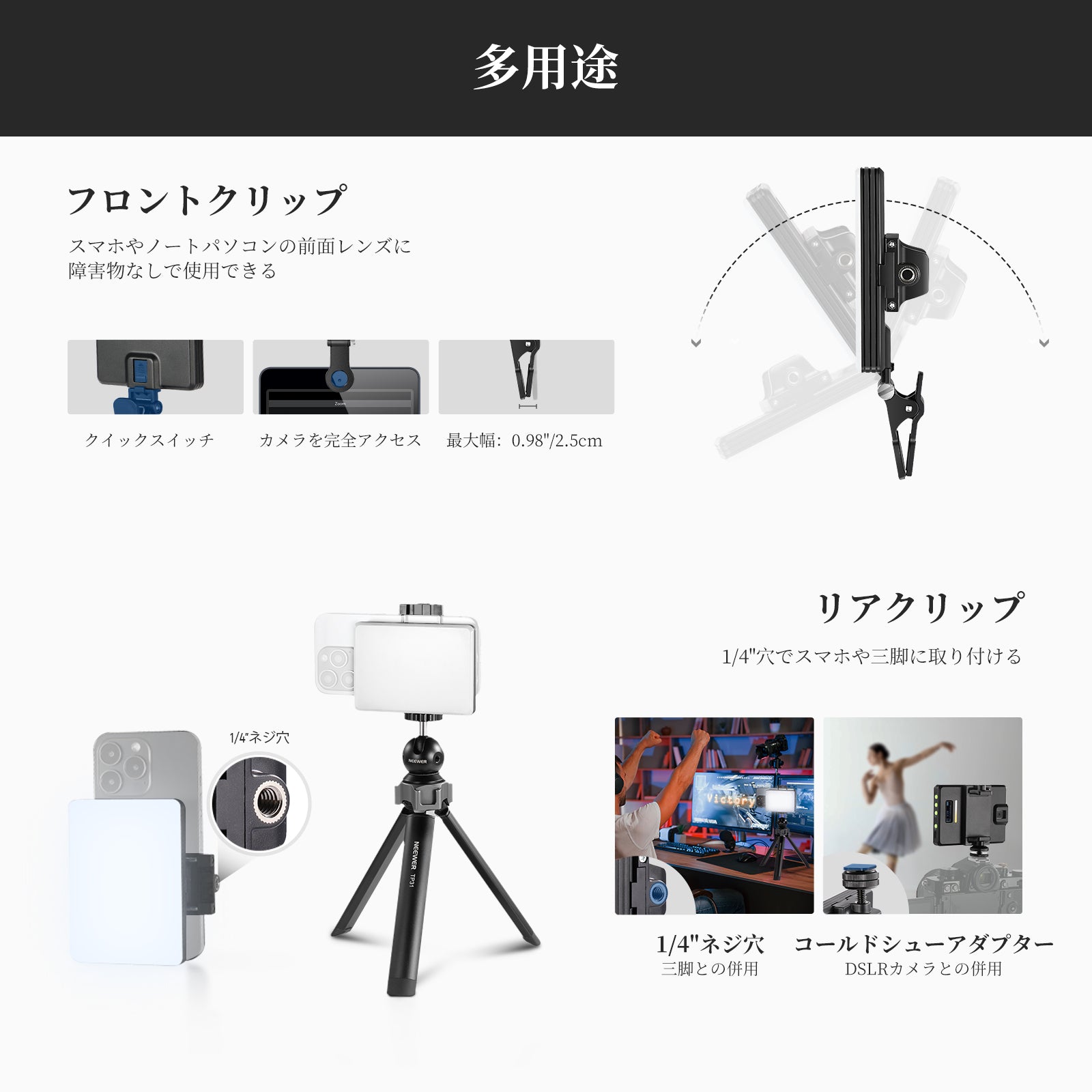 - 【LEDフィルライトアクセサリキット】80個のLED (暖色 40 個、白色 40 個) を備えた5WミニLED パネルポータブルライトは、0.5mで最大520luxの照度と97の高 CRI を提供します。クリップオンライトを、厚さ 0.98 "/ 2.5 cm 未満のスマホ、タブレット、ラップトップ、コンピューター、デスクトップモニターに取り付けるか、リアクリップを使用して、iPhone 16 Pro Max、Plus、15、14、13、12、Mini、Samsung Galaxy Note、Google Pixel、Huaweiなどと互換性のある2"-3.3"/5.2-8.5 cm の開口部を備えた自撮りフィルライトの背面に携帯電話を取り付けます。