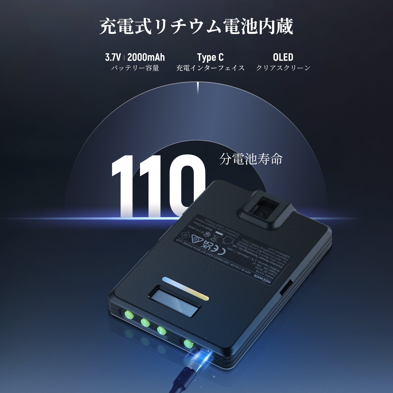 【2000mAh充電式リチウムバッテリー】3.7V、2000mAhリチウムバッテリーは、100% の明るさで最大110分間の連続照明をサポートします。5V、2AタイプCポートを介してわずか 110 分で完全に充電でき、使用中にシームレスな充電をサポートし、一日中途切れることのない電力を確保します。