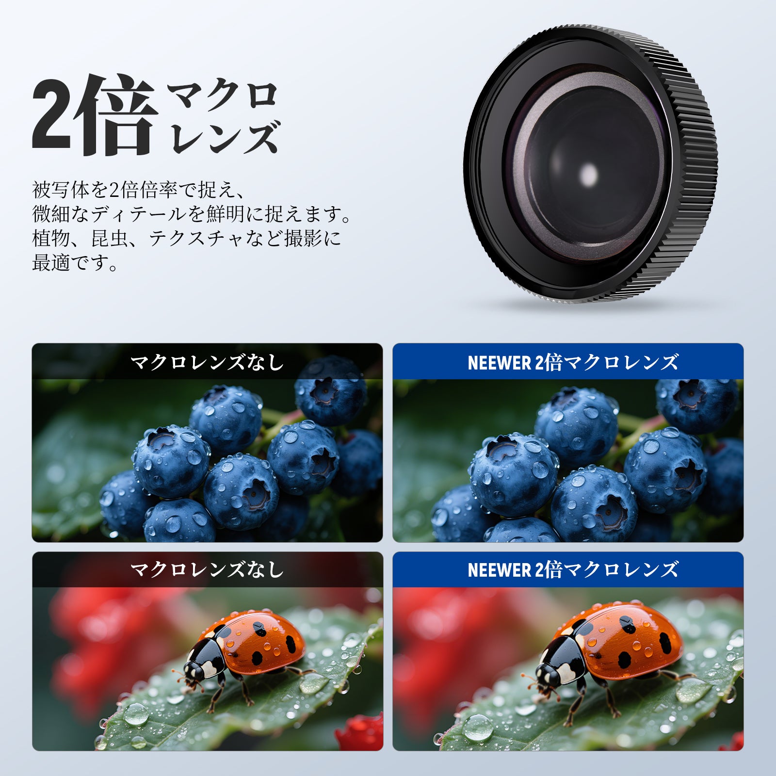 - 【2倍マクロレンズ】拡大マクロレンズは3-4cm(標準レンズの最短撮影距離よりもはるかに短い)の距離から複雑なディテールを鮮明に捉え、被写体を2倍倍率に拡大して撮影し、植物、昆虫、テクスチャなどの撮影に最適です。