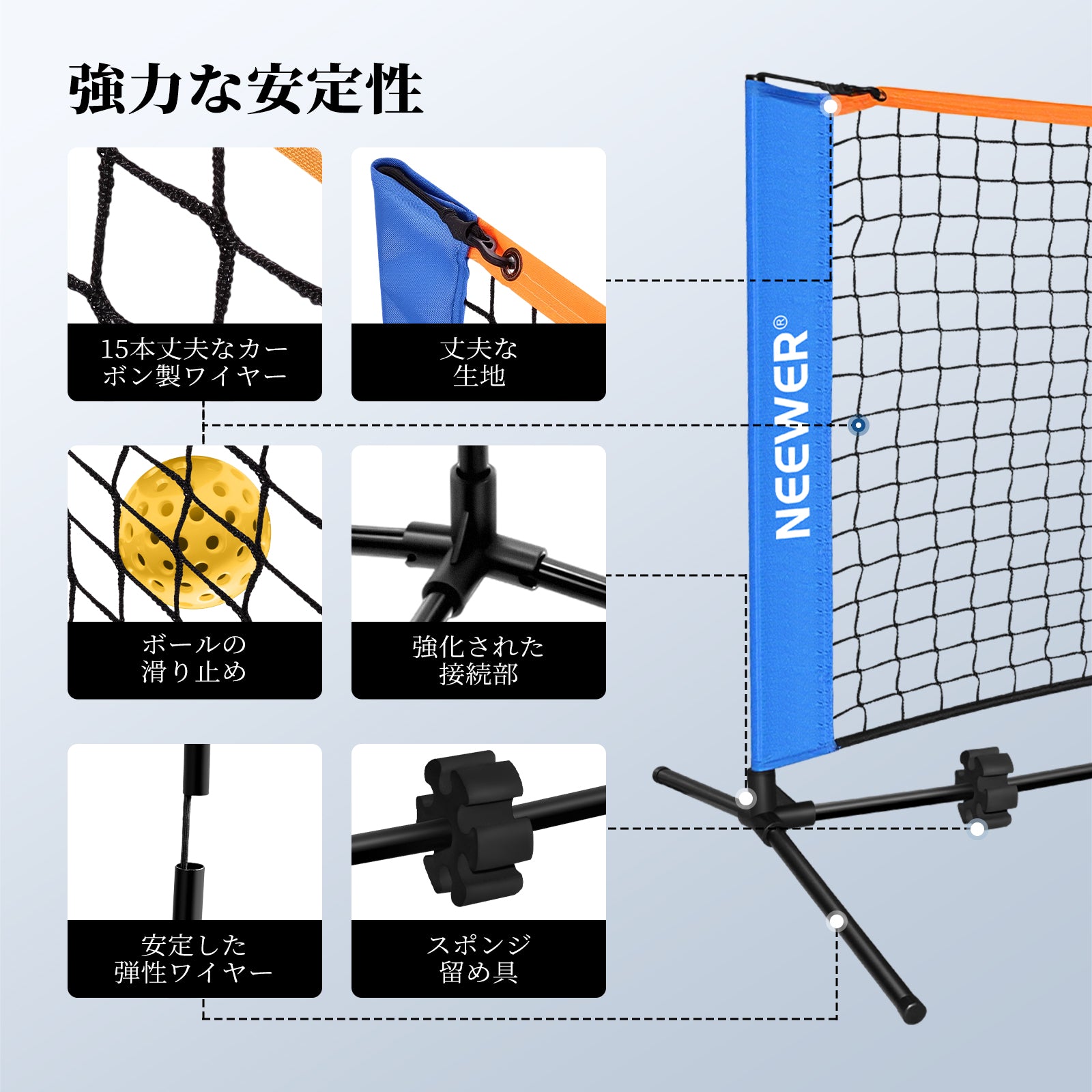 - 【強化編みコード】ピックルボールネットは15本丈夫なカーボン糸で編まれた太い編みコードで作られており、高耐久性と耐摩耗性を備えています。3.175×3.175cmネットグリッドにより、ピックルボールが滑り落ちることはありません。