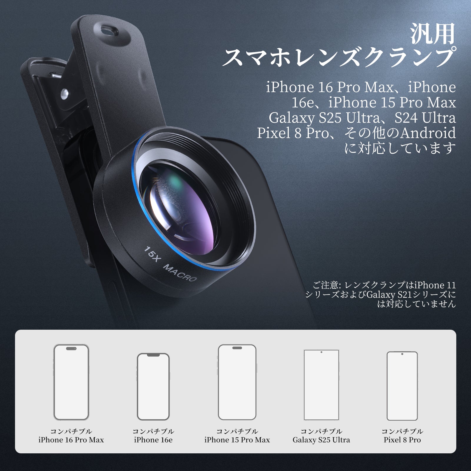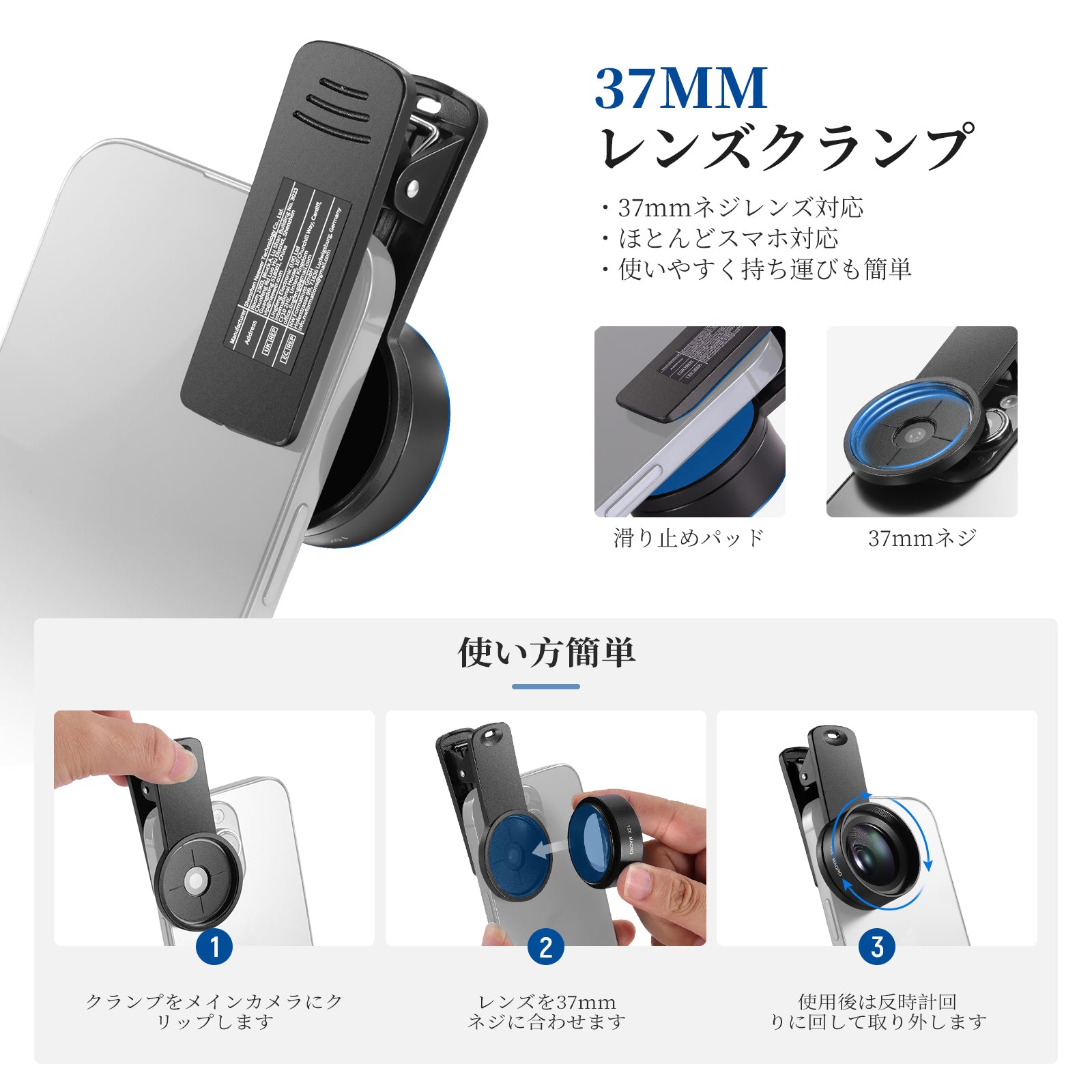 - 【37mmネジ付きレンズクランプ】スマホ各種に装着可能なレンズクリップで、37mmネジによりマクロレンズをしっかり取り付けられます。iPhone 17 Pro Max 16 16e 15、Android、Samsung Galaxy S25 Ultra などに対応しています。コンテンツクリエイター必須のスマホカメラアクセサリーとして、ズームレンズ装着に最適で、インフルエンサー必携の撮影・撮影機材です。